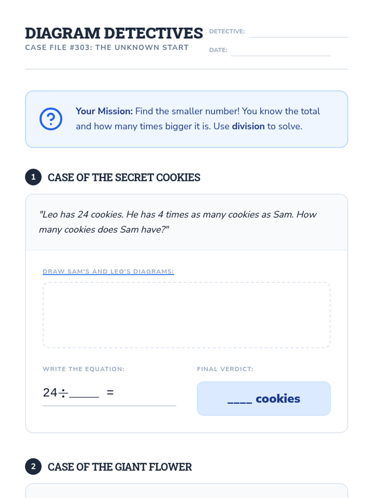 Student worksheet for Lesson 3, focusing on multiplicative comparison problems where the base amount is unknown and must be solved using division.
