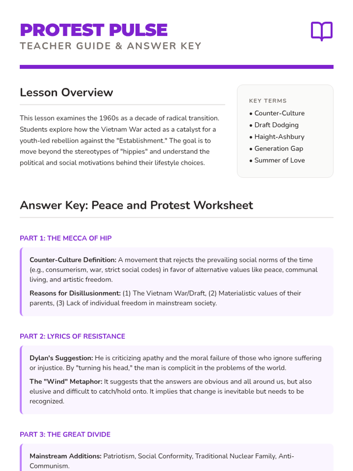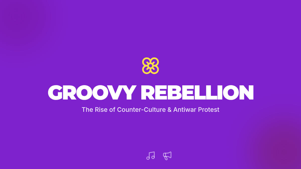 A vibrant slide deck aligned with HMH Module 29 Lesson 3, covering the New Left (SDS, FSM), the class-based draft system, Hawks vs. Doves, and the counter-culture movement.