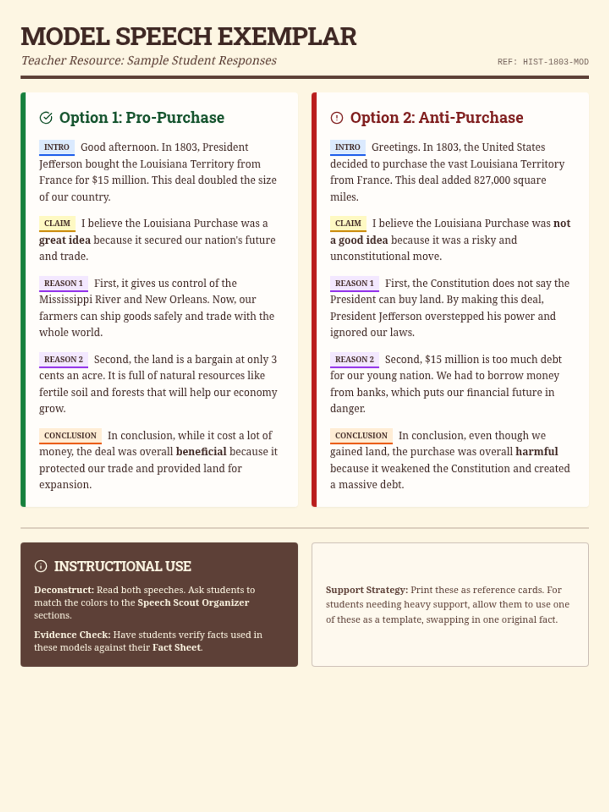 A teacher-facing model speech exemplar that demonstrates high-quality "pro" and "con" responses to the Louisiana Purchase assignment, including annotated sections for instruction.