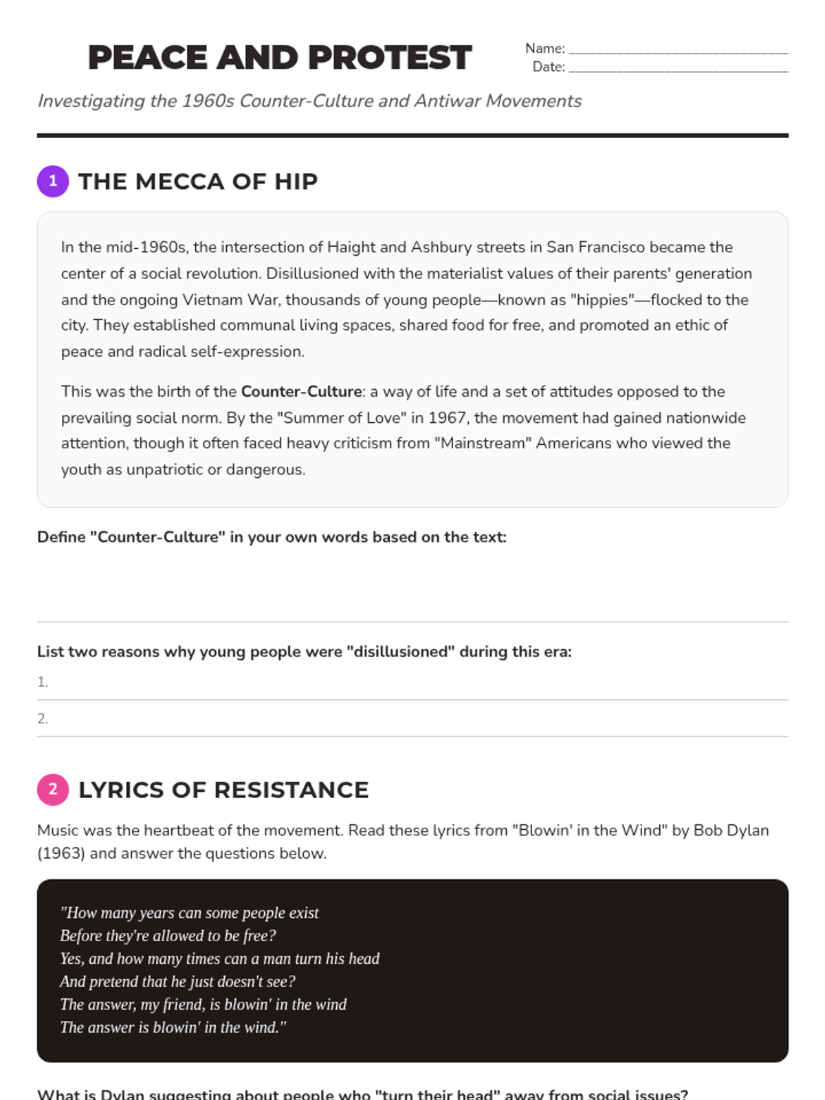 A student worksheet aligned with HMH Module 29 Lesson 3, featuring Hawks vs. Doves, draft deferments, the New Left (SDS/FSM), and Bob Dylan lyric analysis.