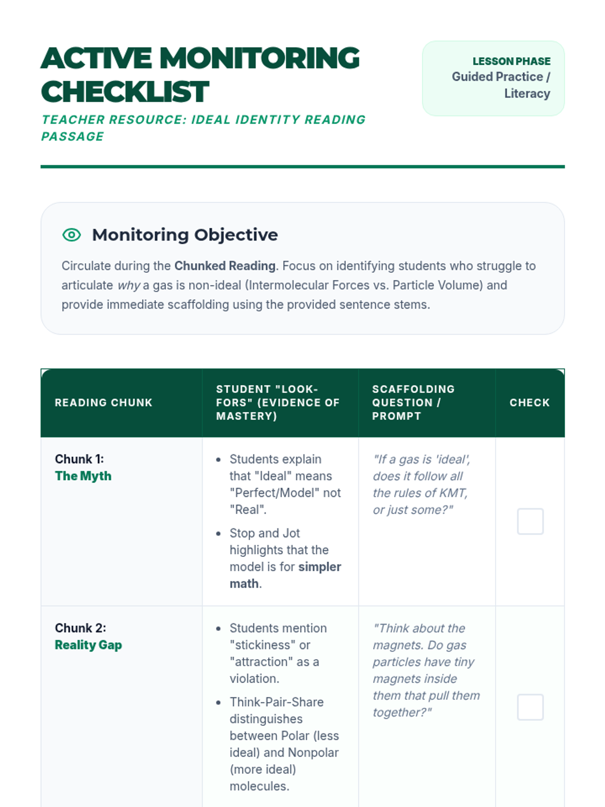 A teacher facilitation guide and monitoring checklist for the Ideal Identity Chunked Reading Passage. Includes specific look-fors for each reading chunk, scaffolding questions to address misconceptions, and a mastery checkpoint for formative assessment.