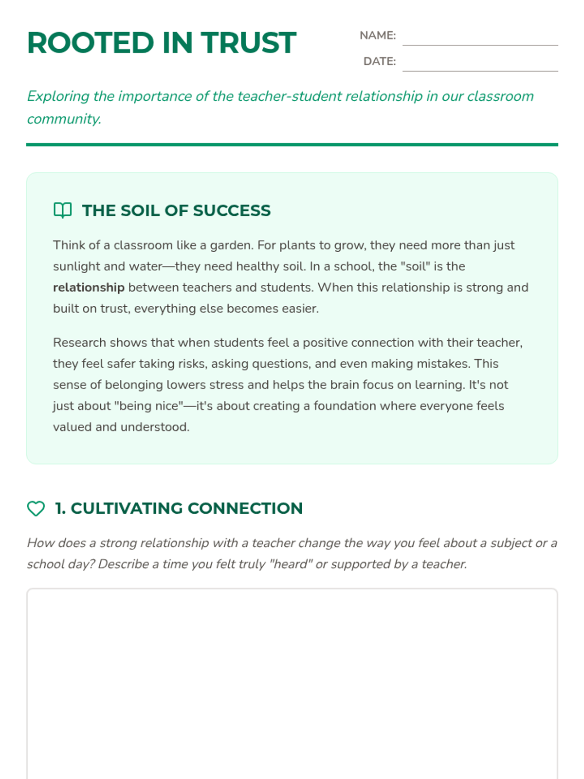 A reflective student worksheet focused on the importance of the teacher-student relationship in building classroom community. It includes a reading passage, reflection prompts, and a creative space for visualization. Revised for better page flow and student work space.