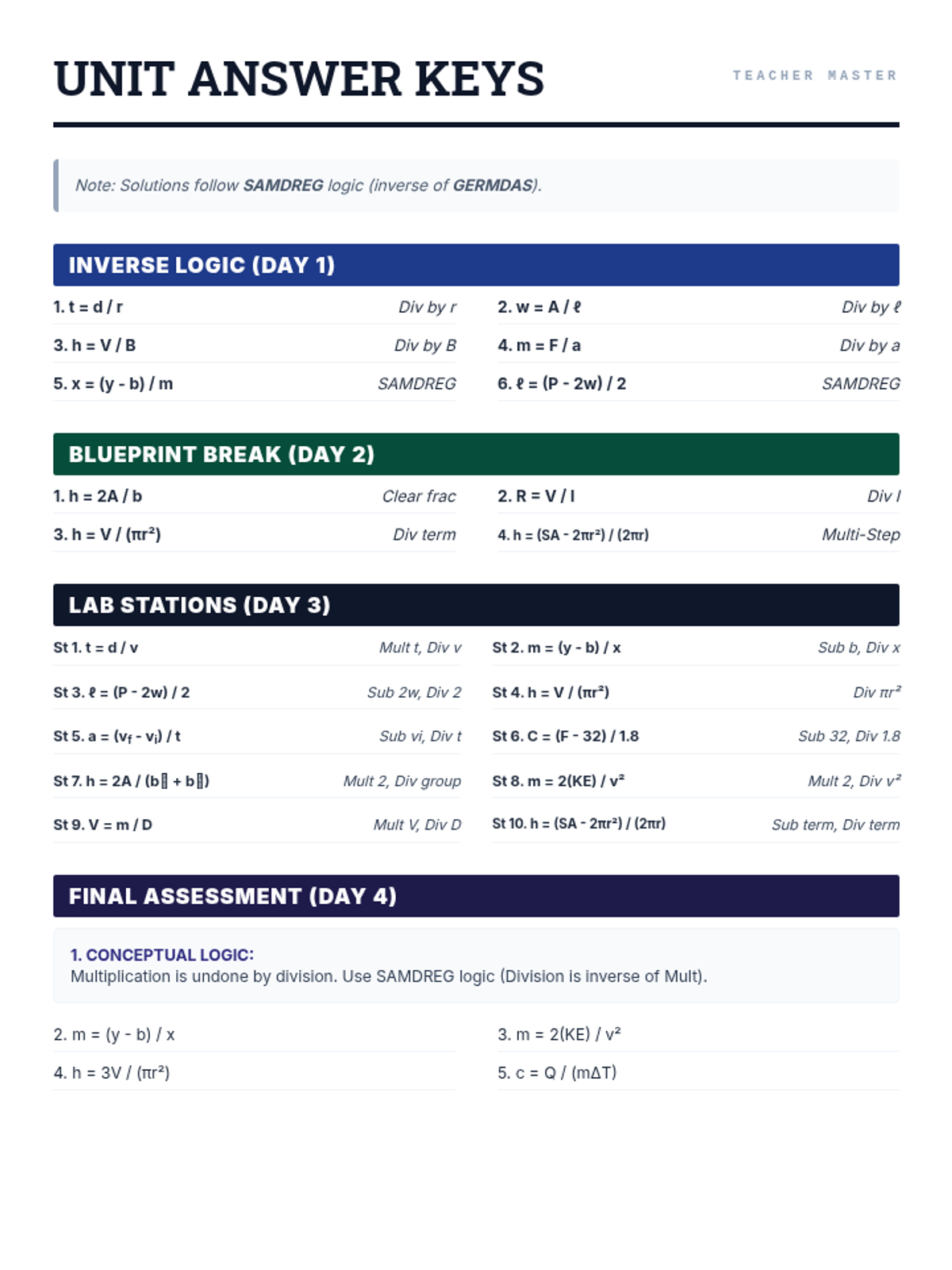 Comprehensive unit answer key. Expanded to include all 10 lab stations with the new multi-step and exponent-based formulas. Expanded to include Day 2 (Blueprint Break) solutions. Maintained consistency with SAMDREG/GERMDAS terminology. Updated with improved letter spacing for readability. Corrected subscript rendering. Added logic steps for all stations.