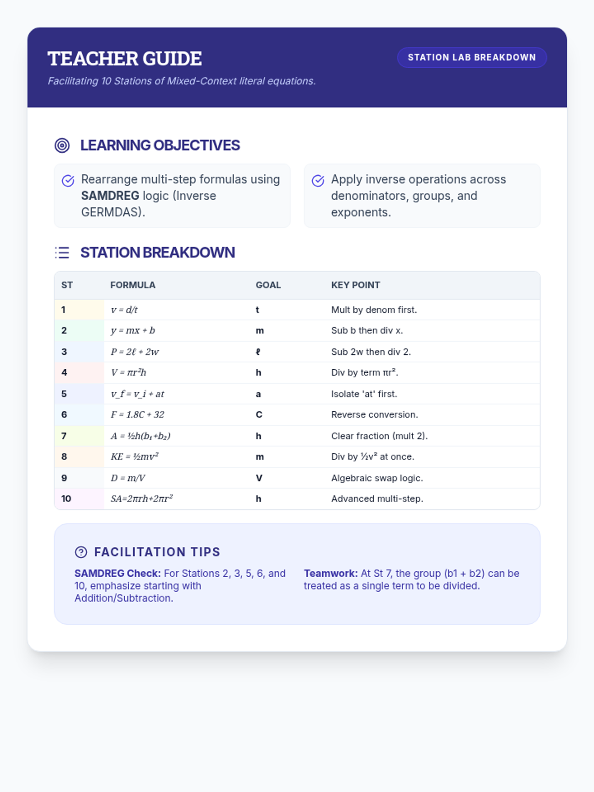 Teacher facilitation guide for the station lab. Updated to match the new multi-step and exponent formulas, with specific instructional guidance for each of the 10 stations. Corrected rendering for Station 7 and removed raw LaTeX.