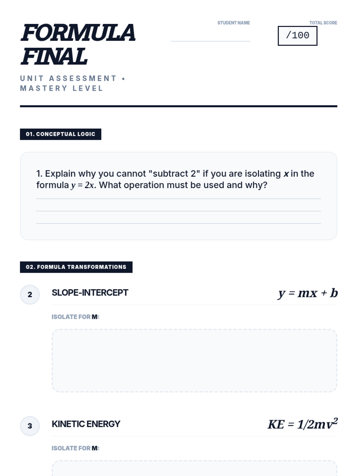 Formal unit assessment for literal equations. Updated with fixed rendering of fractions, improved response areas, and improved page-break logic.