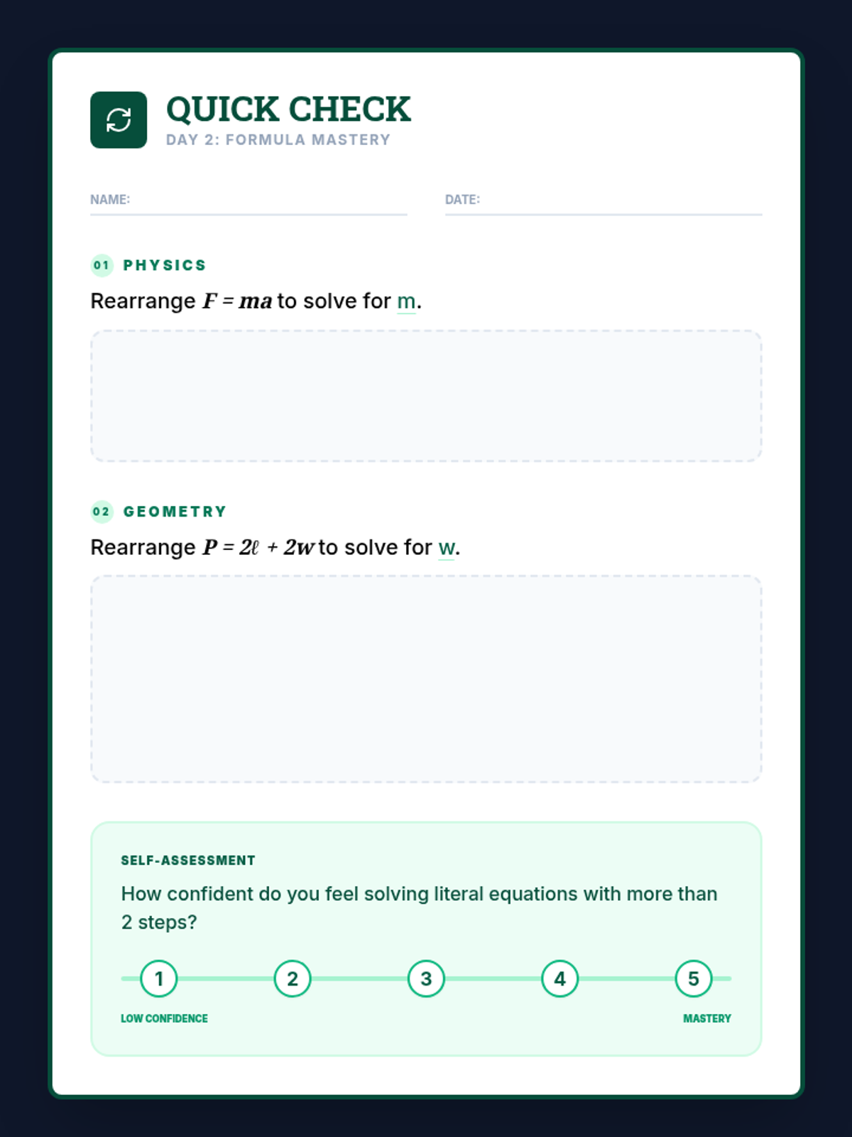A quick-check formative assessment. Updated with wider layout, fixed page breaks for the self-reflection, and improved vertical spacing to fit on one page.