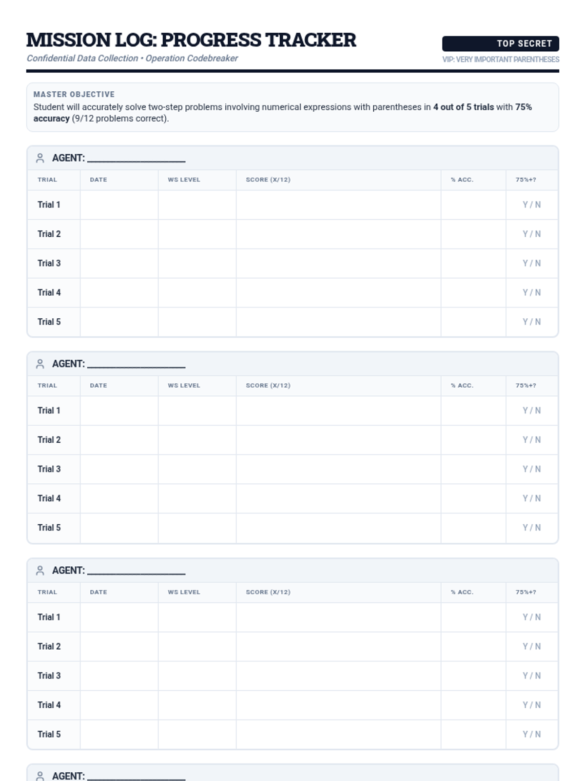 A comprehensive progress monitoring sheet for up to 6 students, designed to track 5 trials of solving numerical expressions with parentheses to satisfy IEP data requirements.