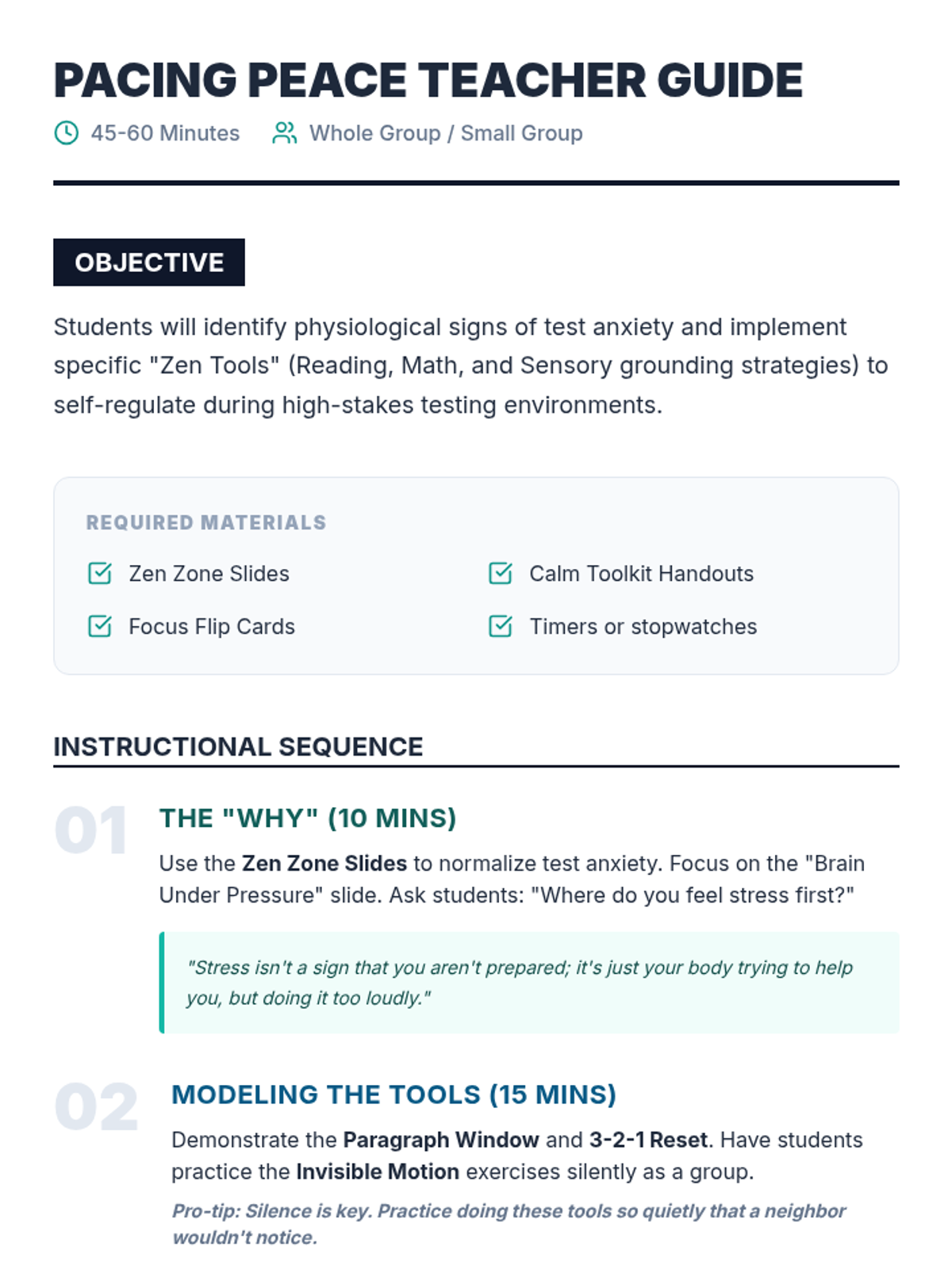 A comprehensive guide for teachers to facilitate the Test Zen lesson, including timing, instructional phases, modeling tips, and differentiation strategies for students with various needs.