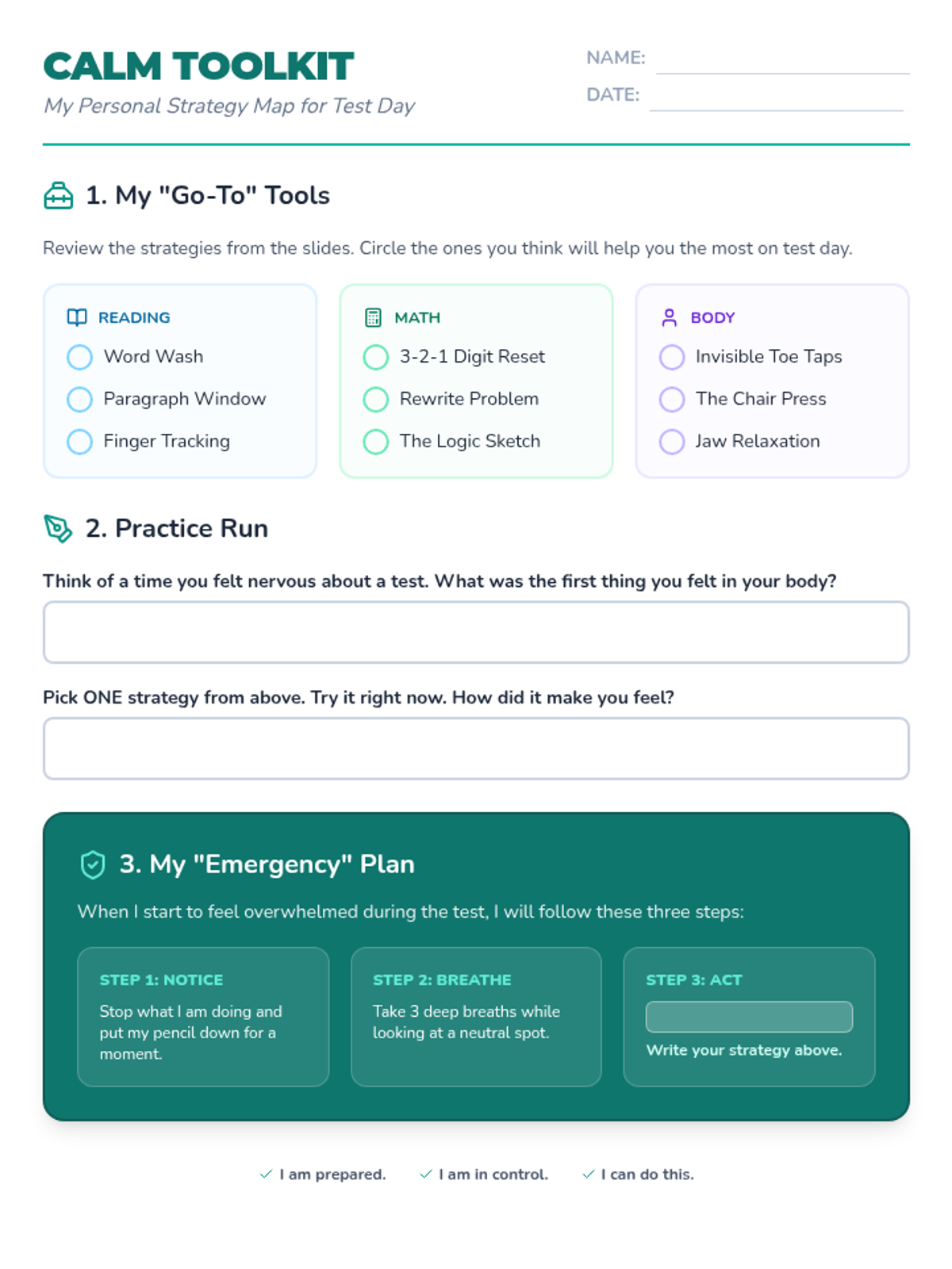 A student worksheet designed to help learners identify and commit to specific anxiety-reduction strategies for testing, including space for reflection and a personalized emergency action plan.