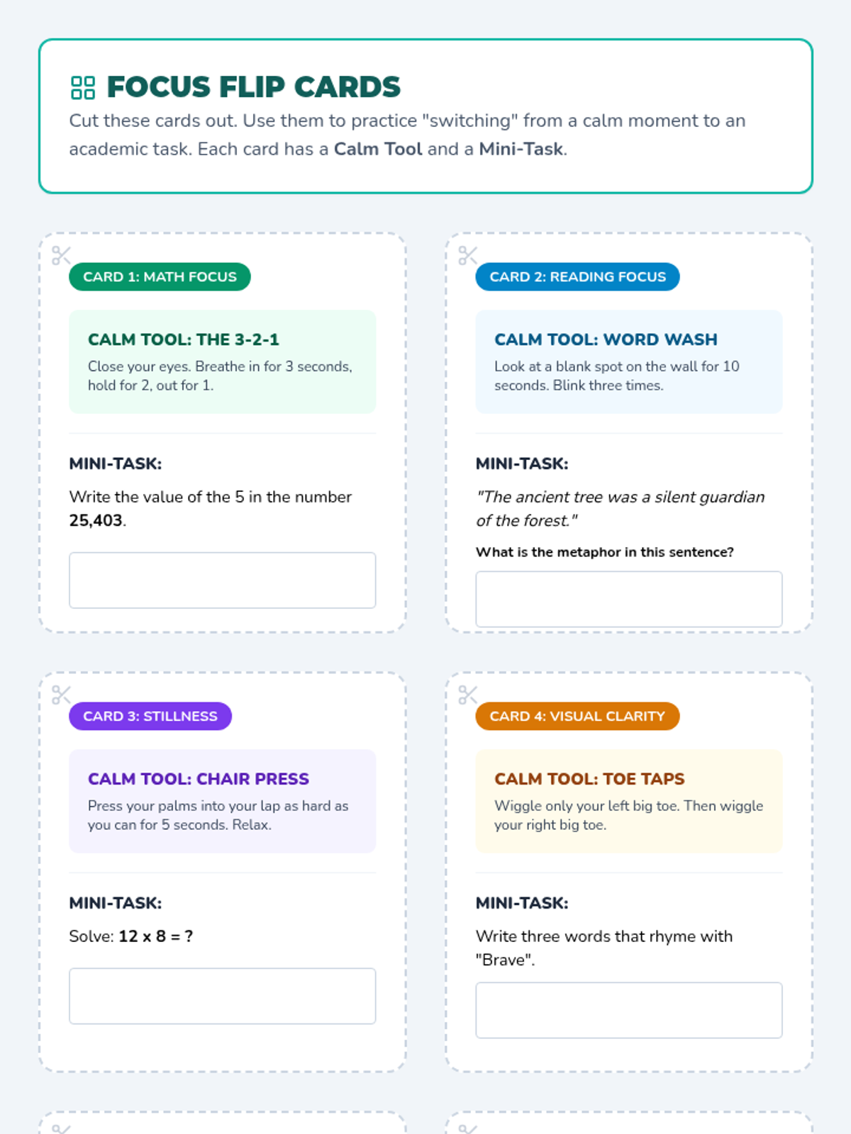 A set of printable task cards that guide students through a mindfulness exercise followed by a brief academic challenge, helping them practice the transition from anxiety to focused work.