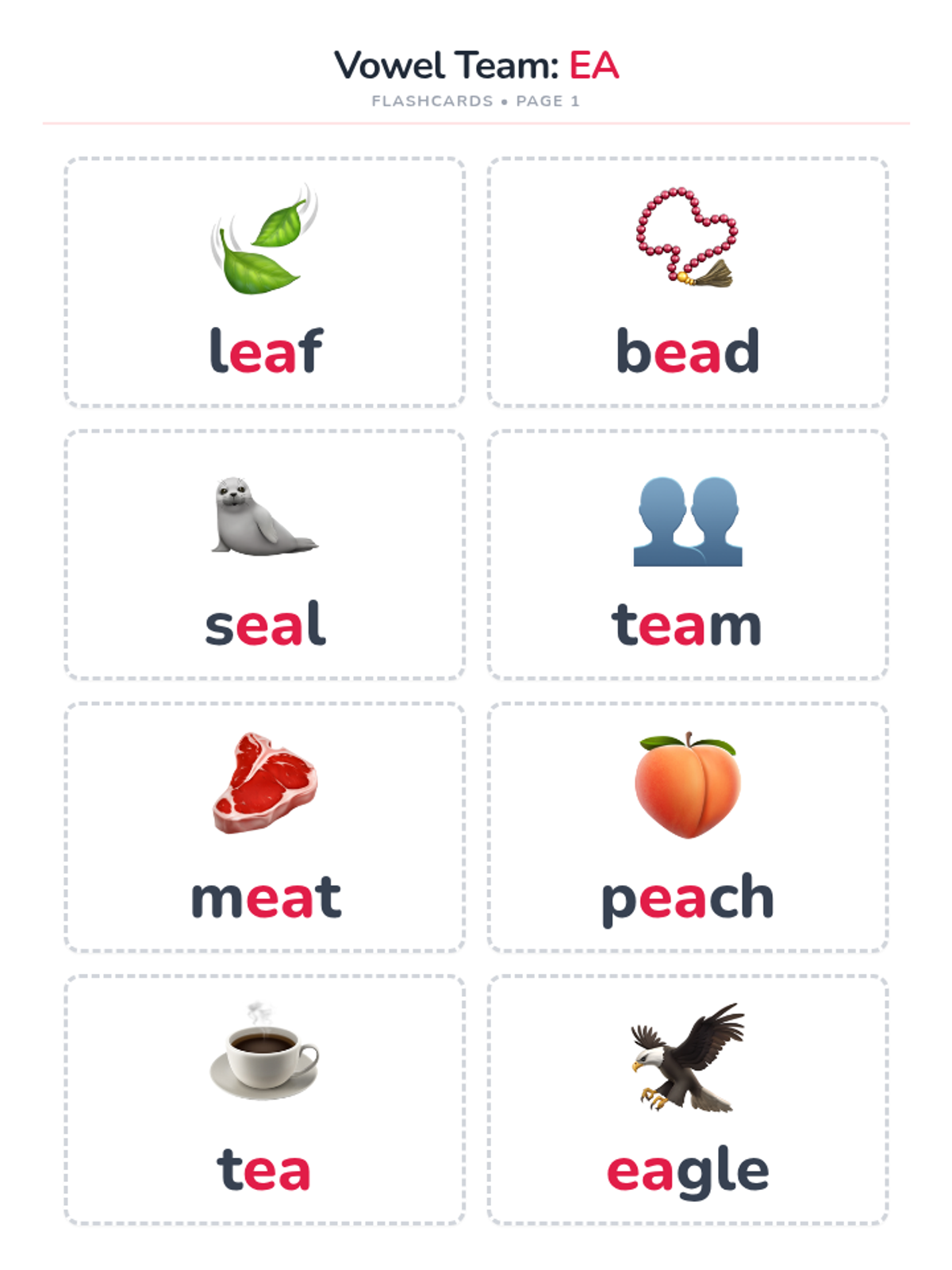 A set of 24 printable flashcards for the vowel teams 'ea', 'ee', and 'ey'. Each card features a colorful illustration (emoji or icon) and the corresponding word with the vowel team highlighted in a distinct color for phonics practice.