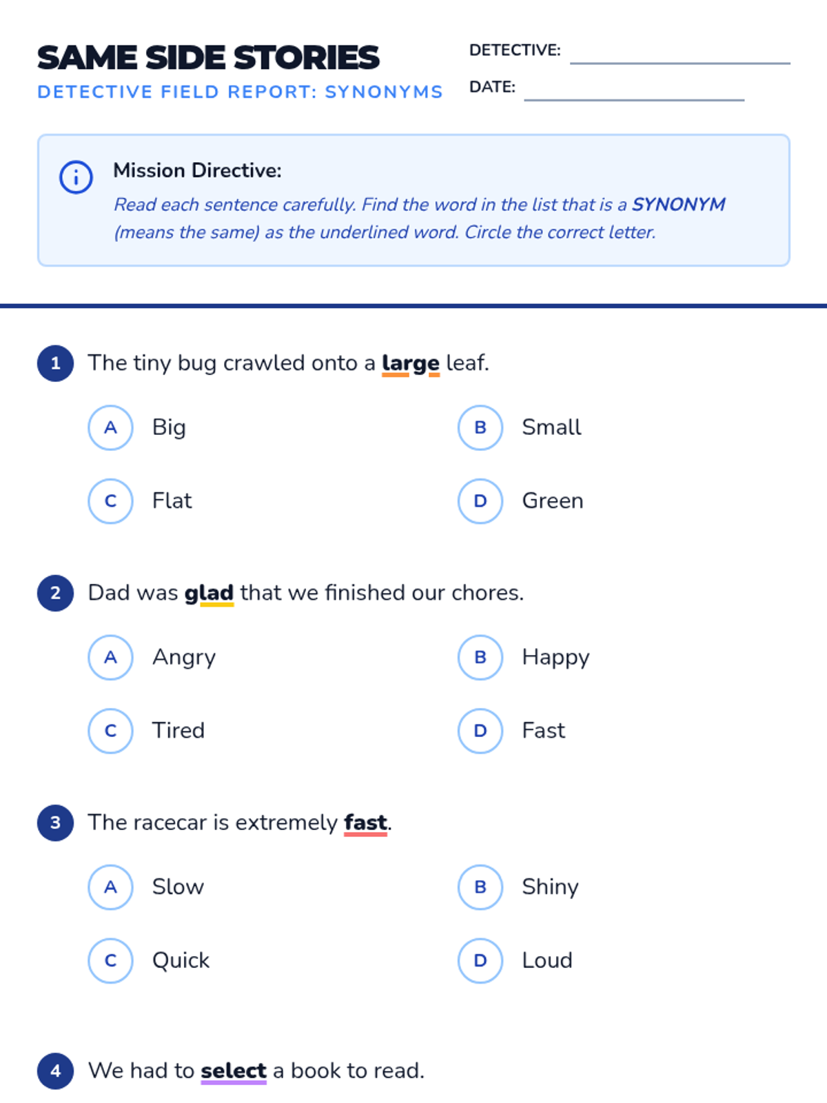 A student worksheet focused on identifying synonyms within sentence contexts. Features 5 multiple-choice questions and a creative writing challenge, complementing the detective theme. Revised to improve page breaks and student work space.