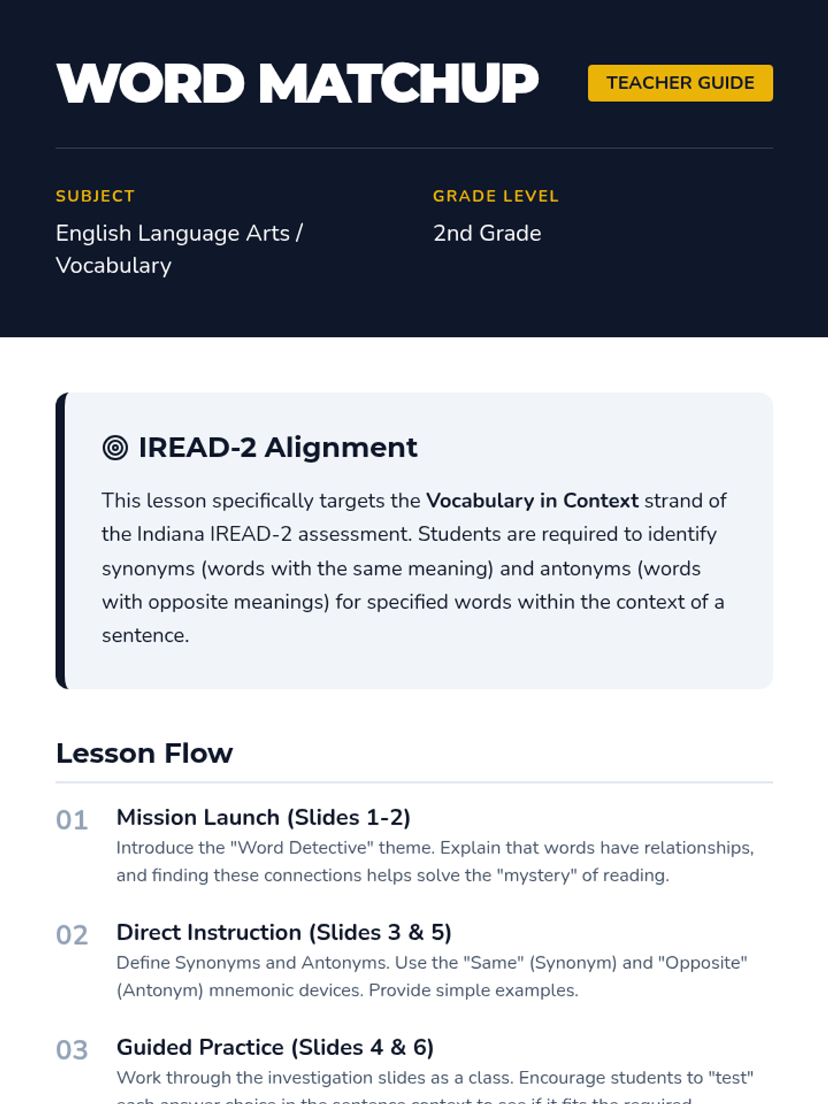 A comprehensive teacher guide for the Word Matchup lesson. Includes IREAD-2 alignment, detailed lesson flow, discussion prompts, and complete answer keys for both student worksheets. Revised to fix page breaks and titling consistency.