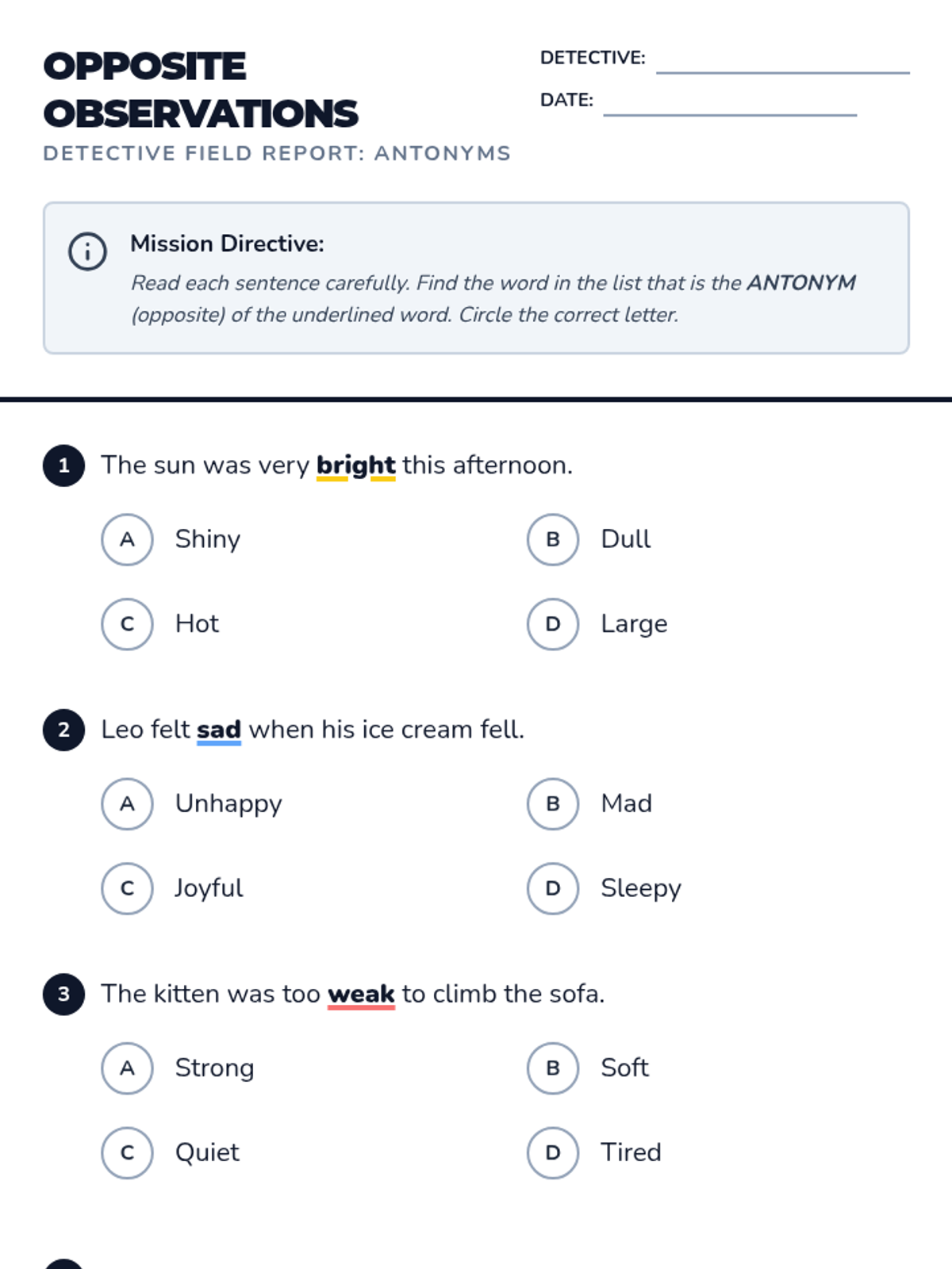 A student worksheet focused on identifying antonyms within sentence contexts. Features 5 multiple-choice questions and a creative writing challenge, all with a detective theme. Revised to improve page breaks and student work space.