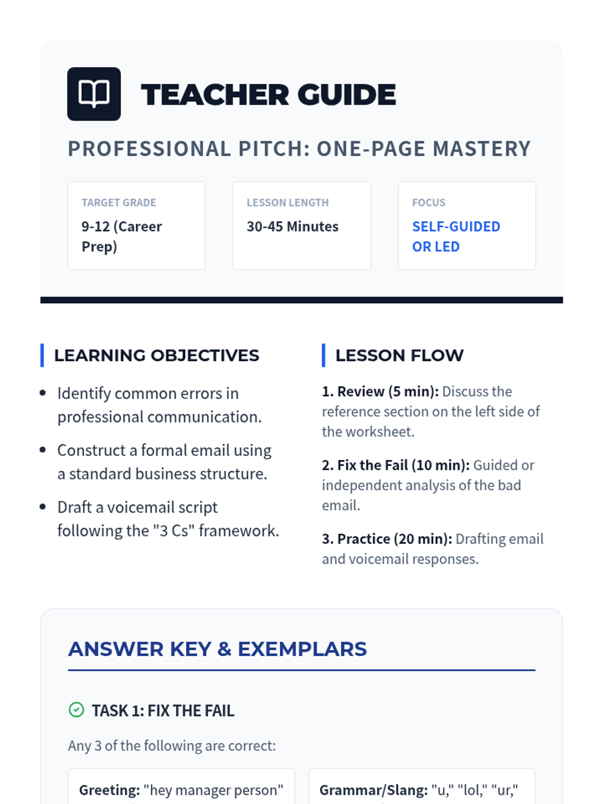 A condensed teacher guide for the one-page Professional Pitch lesson, including learning objectives, a streamlined facilitation plan, and answer keys.