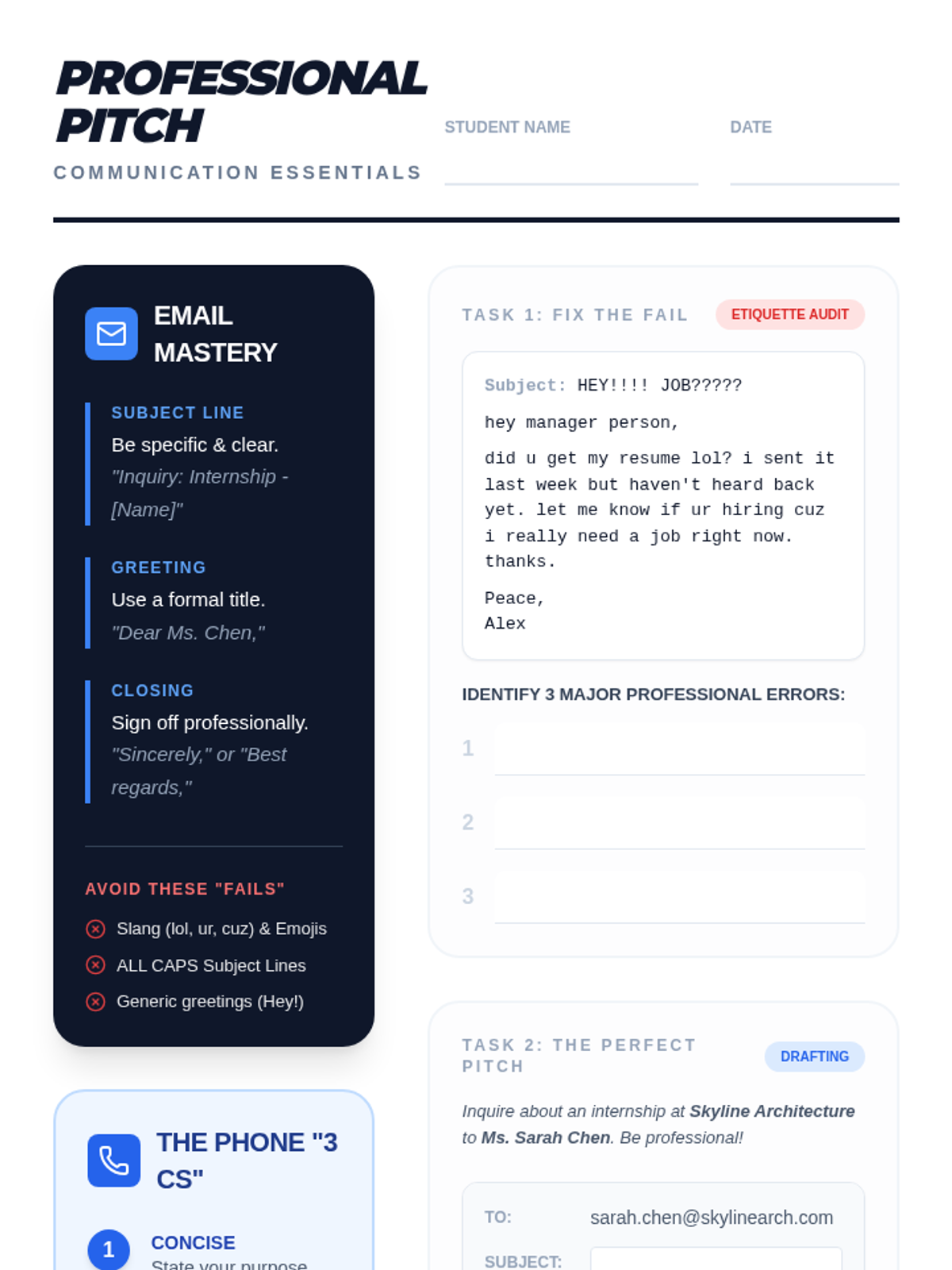 An updated one-page professional communication worksheet with improved spacing, font sizes for readability, and a cleaner layout. Combines instruction with three practice tasks.