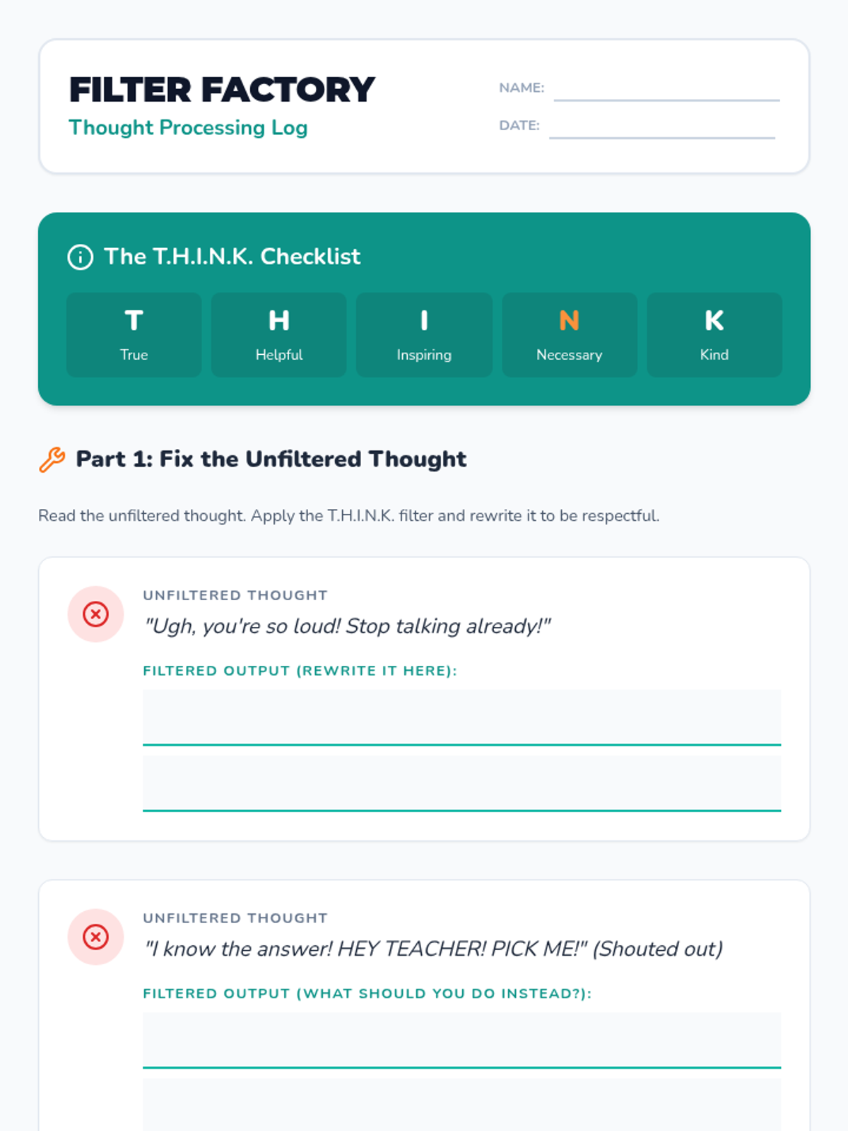 A student reflection worksheet where 4th graders practice rewriting "unfiltered" thoughts, reflect on their own classroom behavior, and sign a "Filter Pledge" for respectful communication.