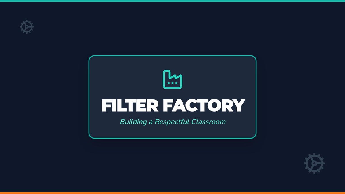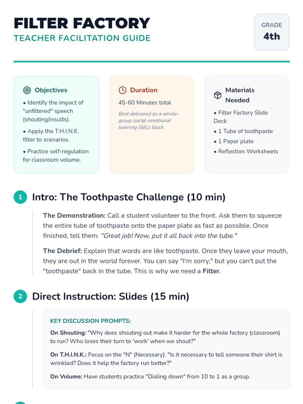 A detailed teacher guide for the Filter Factory lesson, including a "Toothpaste Challenge" introductory activity, discussion prompts, and classroom management strategies for shouting and name-calling.