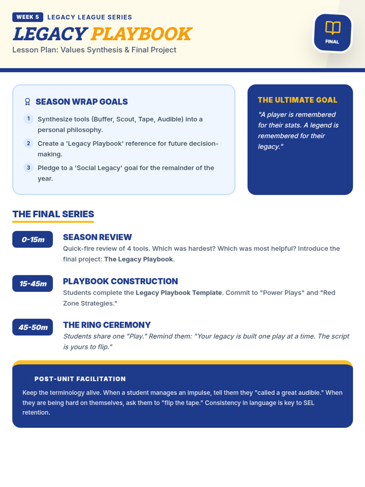 A student-facing final assessment and personal synthesis document. Optimized for single-page printing with improved page breaks, removal of specific year dating, and increased response area sizes. High-impact varsity aesthetic. Fixed handwriting legibility for the final script.