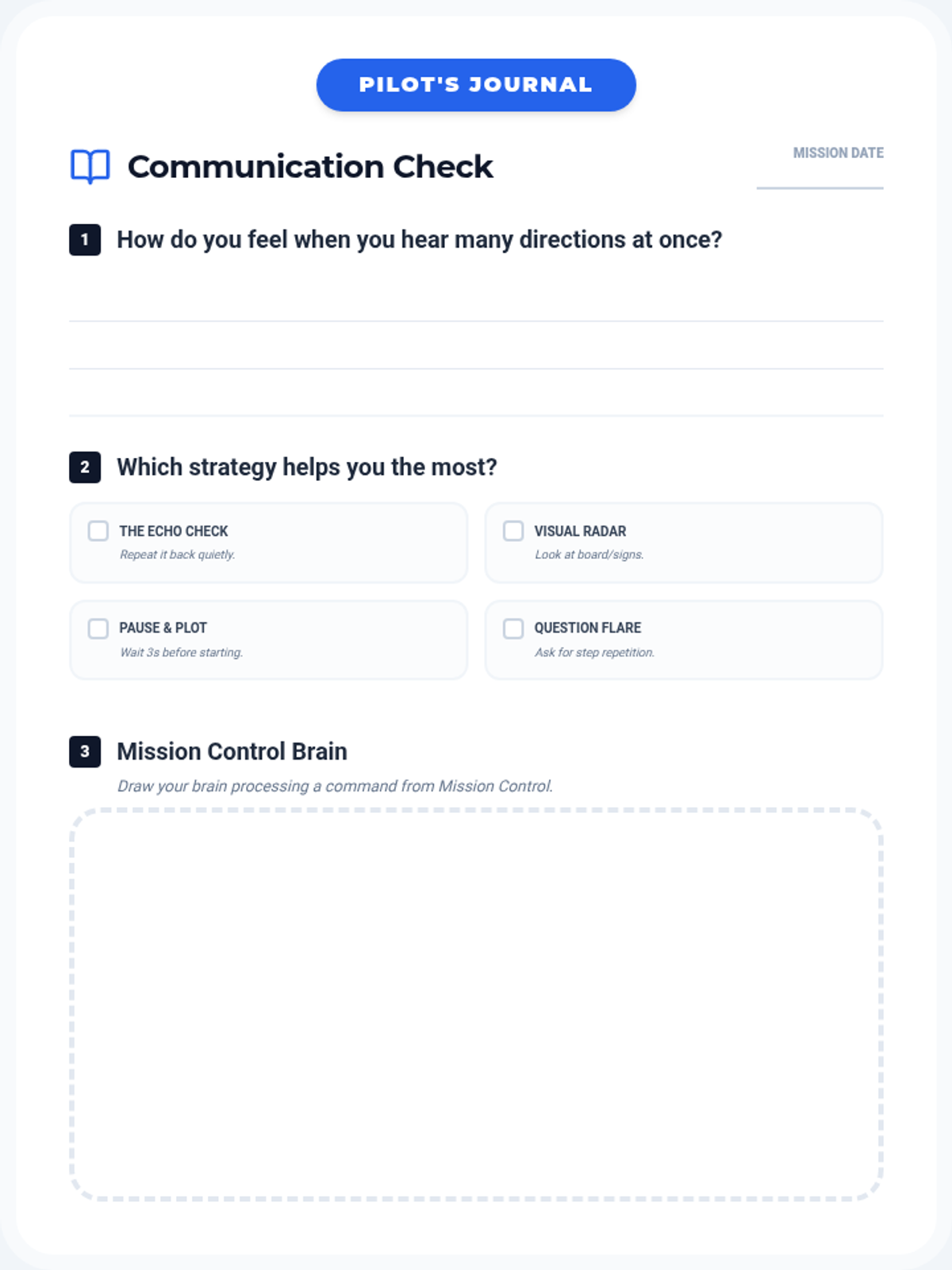 A set of journal prompts for students to reflect on their ability to follow directions, identify challenges, and celebrate successes in their "Mission Control" journey.