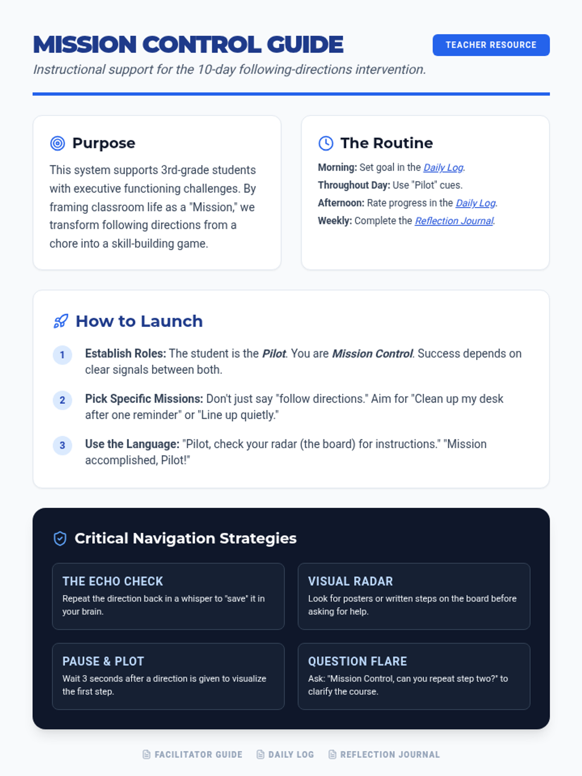 A teacher-facing guide providing instructions on how to implement the Mission Control daily check-in system for students struggling with following directions.