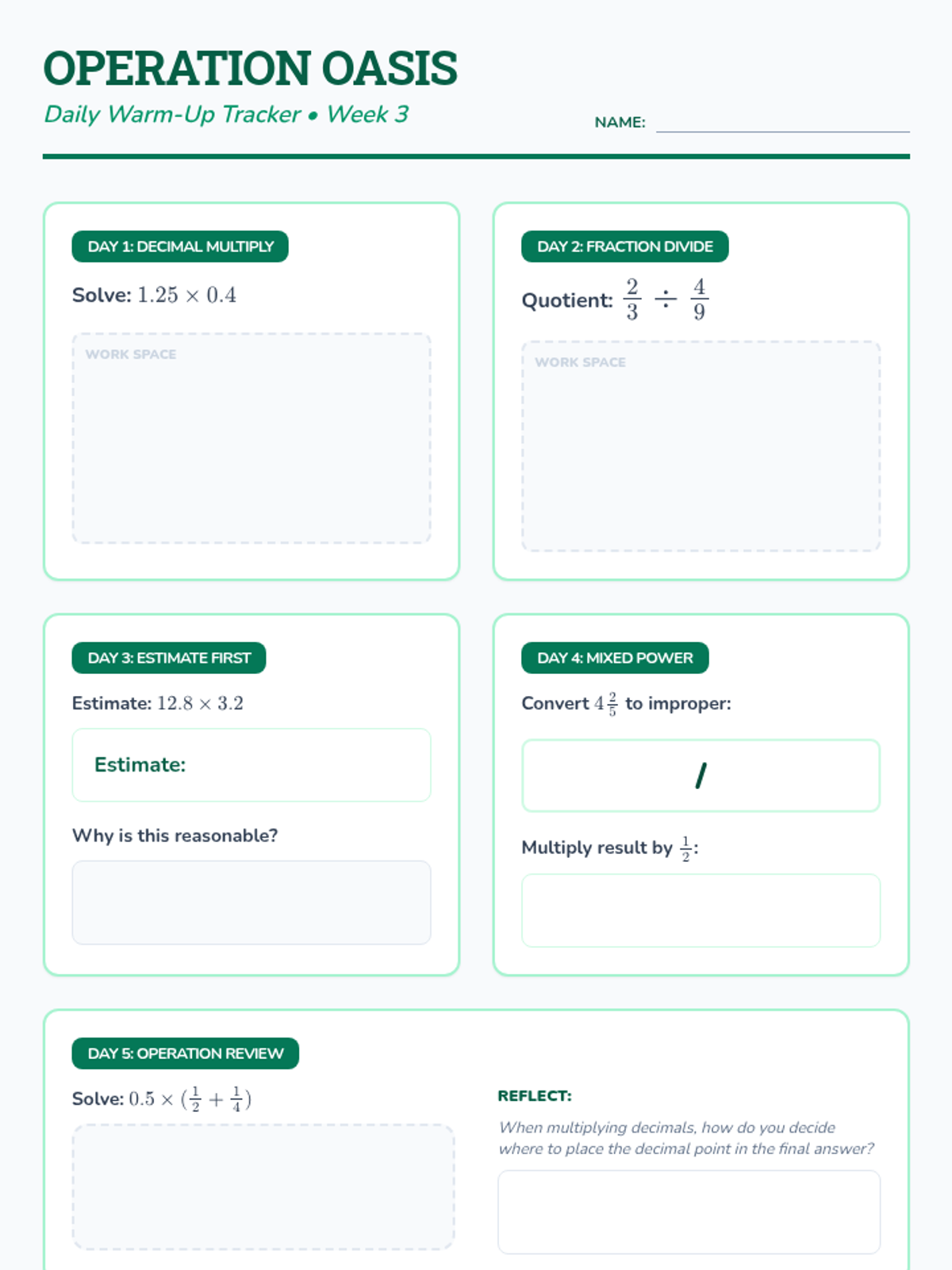 Daily warm-ups for Week 3. Revised to include Day 5, standardized work area colors, and consistent math formatting.