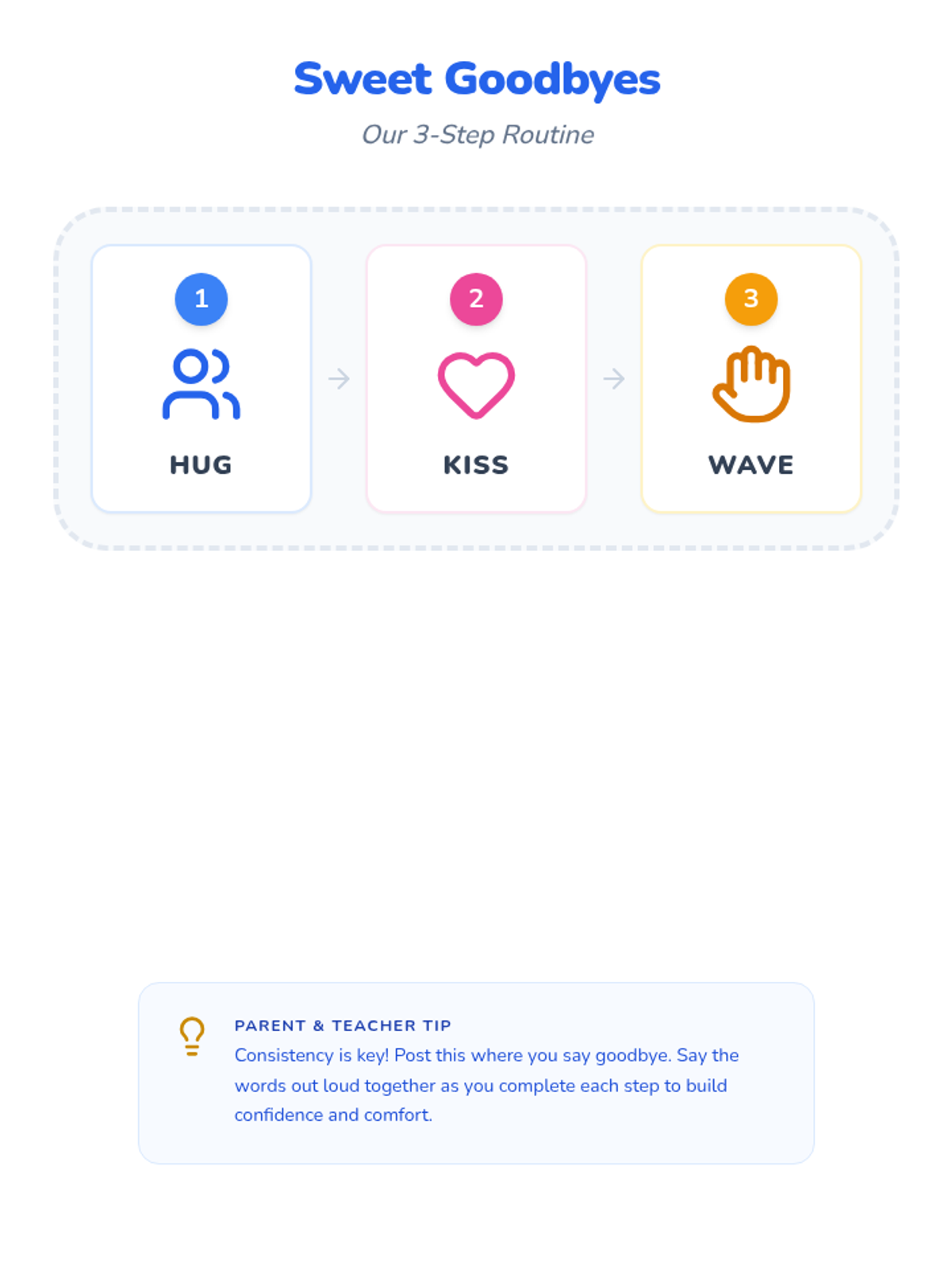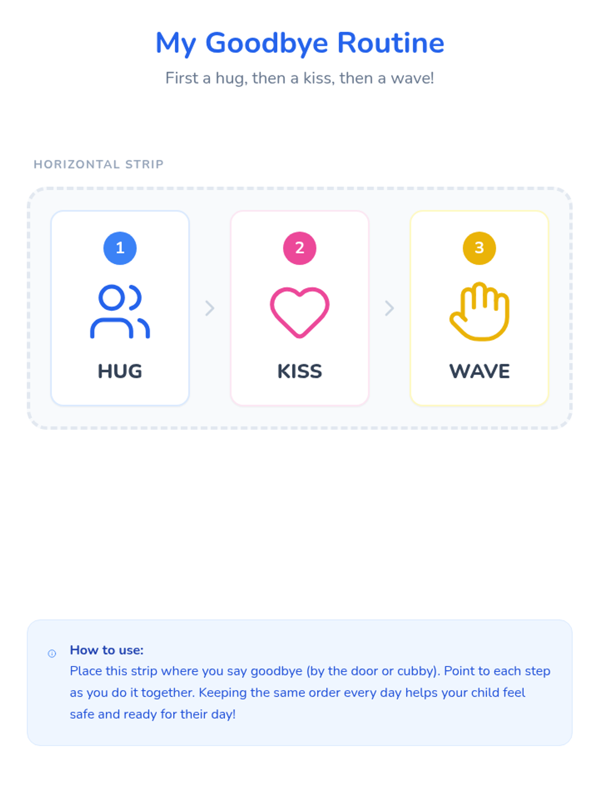 A clean, high-contrast visual strip featuring a 3-step goodbye routine (hug, kiss, wave) in both horizontal and vertical formats. Uses friendly line-style icons and bold text for early learners. Revised for better icon clarity and print layout.