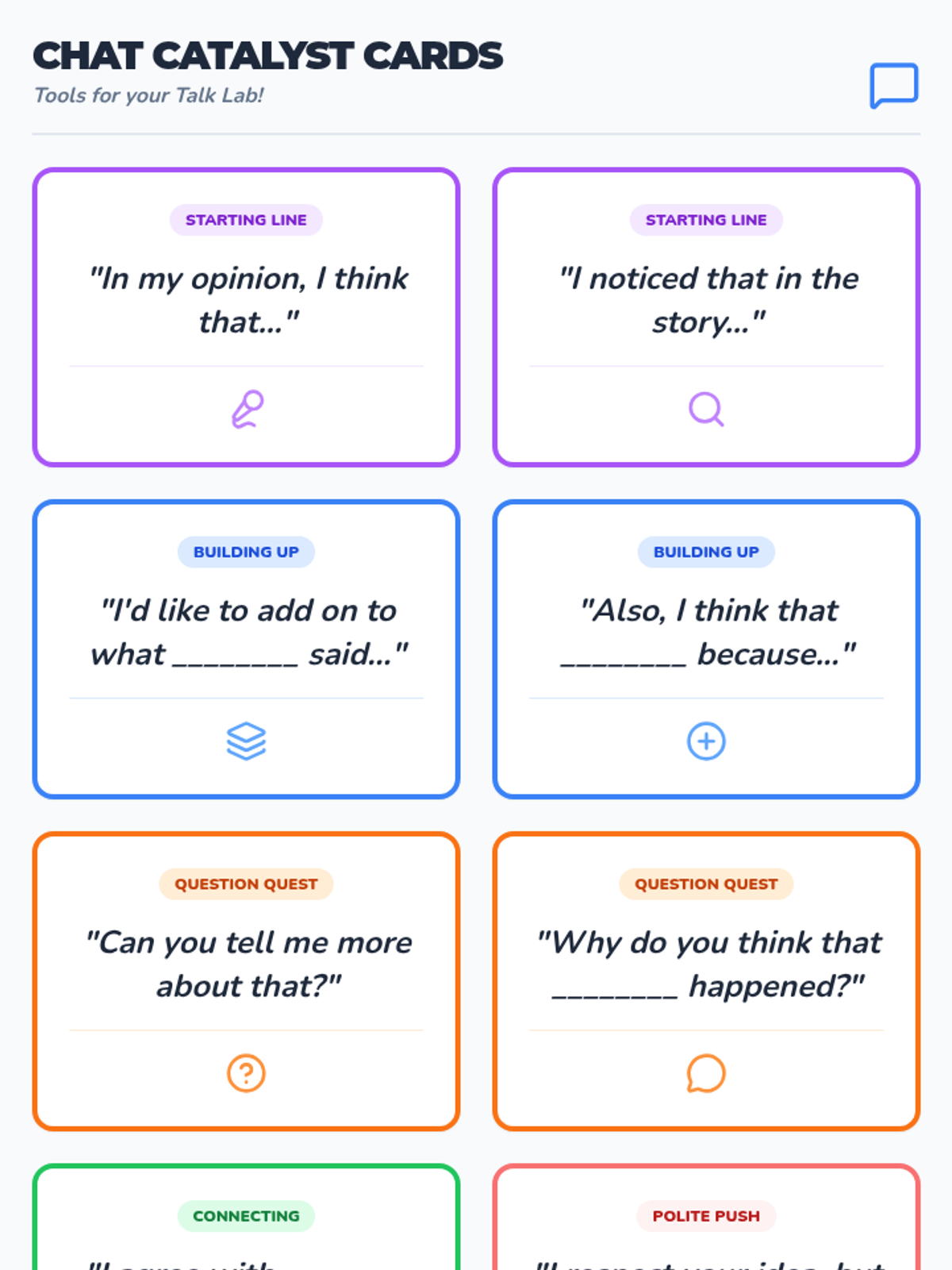 Eight printable sentence starter cards designed to help elementary students initiate, build upon, and politely disagree during academic discussions.
