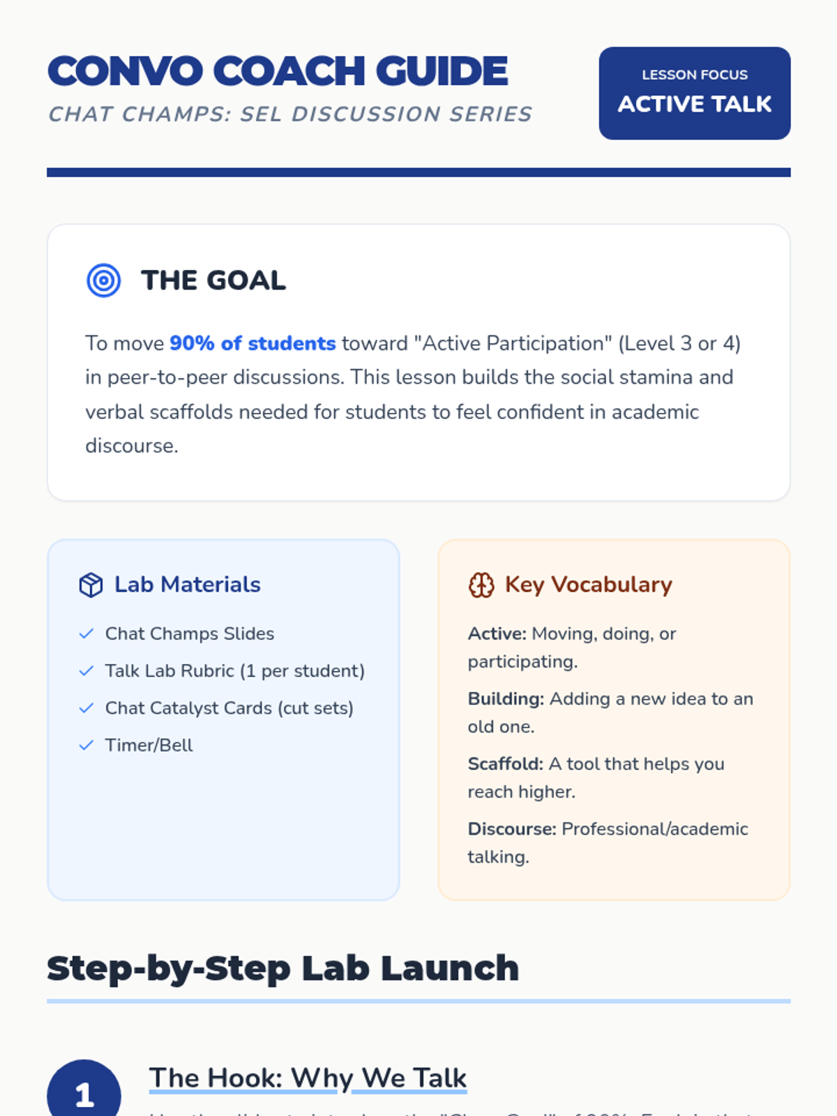 A teacher facilitation guide for the Chat Champs lesson, featuring instructional strategies like the "Fishbowl" technique and differentiation tips to meet the 90% participation goal.