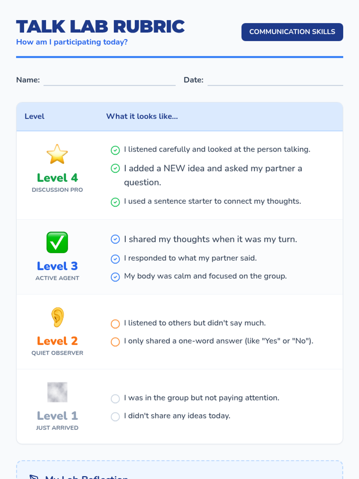 A visual participation rubric for elementary students to self-assess their involvement in academic discussions, featuring four levels of engagement with clear descriptions and icons.