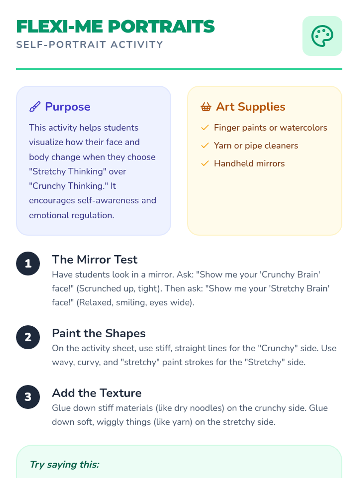 A two-part self-portrait activity where students use art supplies to visualize themselves in 'Crunchy' vs 'Stretchy' thinking states. It includes a teacher's guide and a structured student work page.