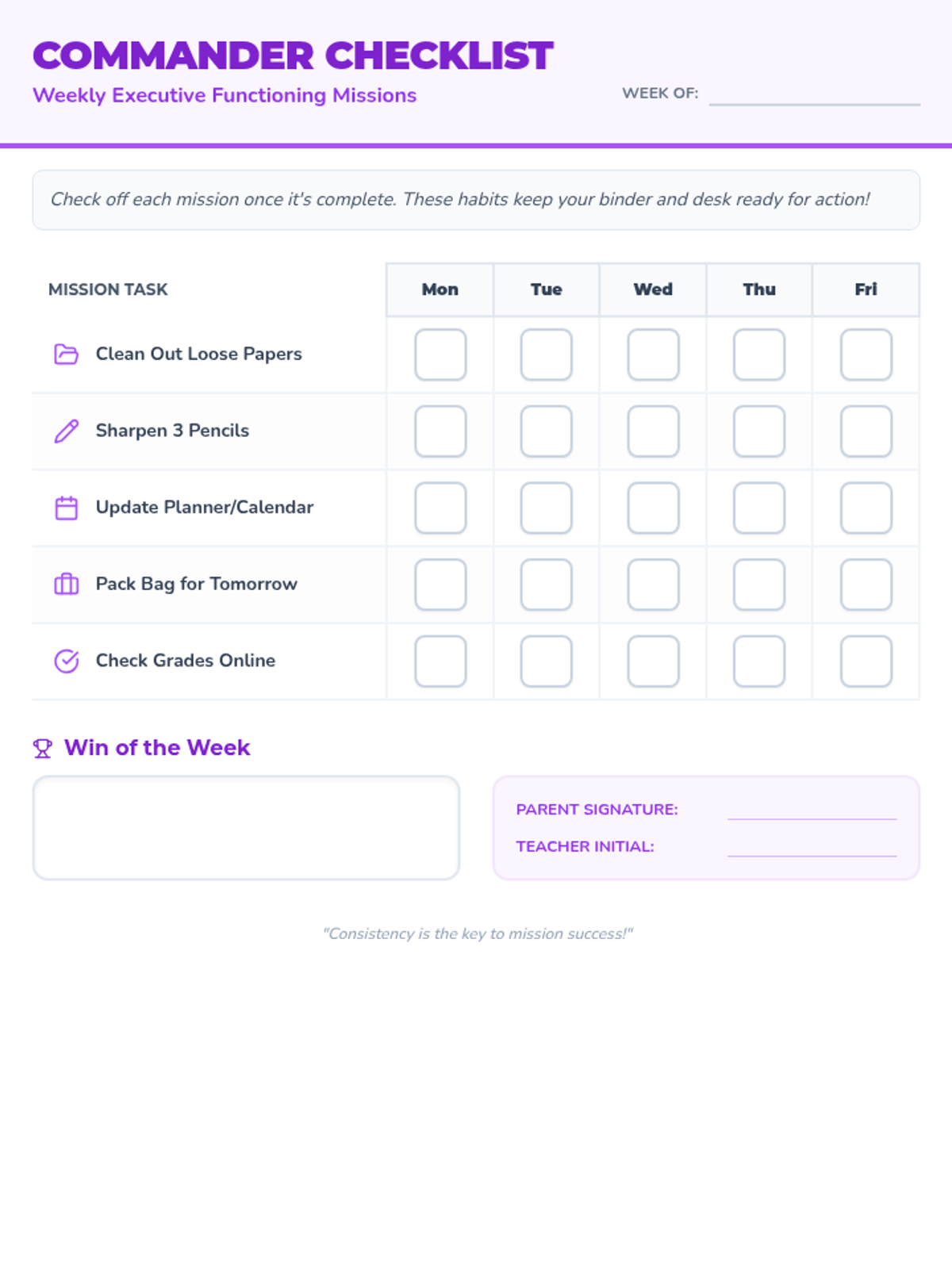 A revised weekly executive functioning checklist for IEP students to track recurring tasks like binder organization and bag packing, including reflection space.