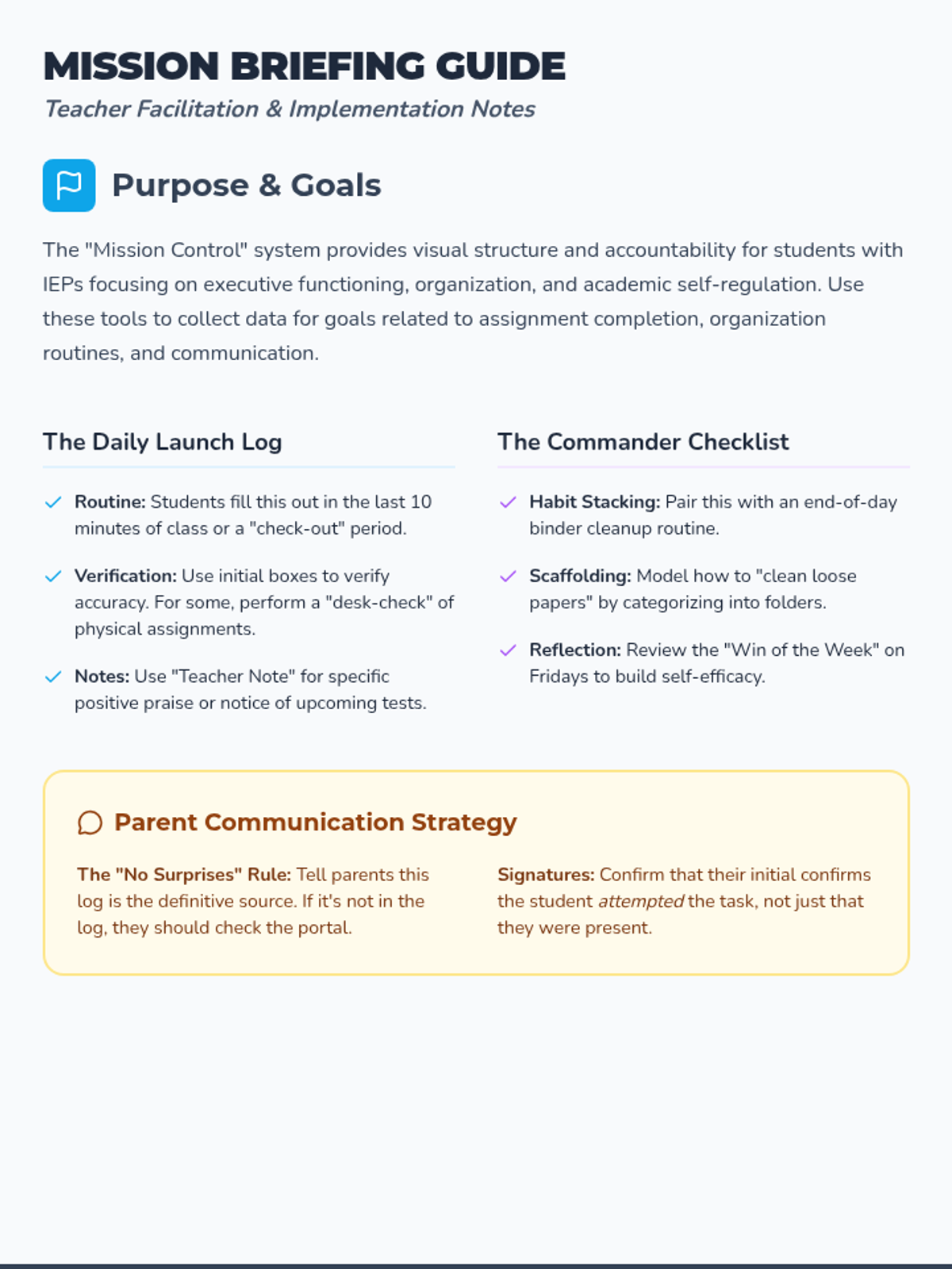 A revised teacher guide for implementing the Mission Control tracker system, including differentiation strategies, IEP goal alignment, and parent communication tips.