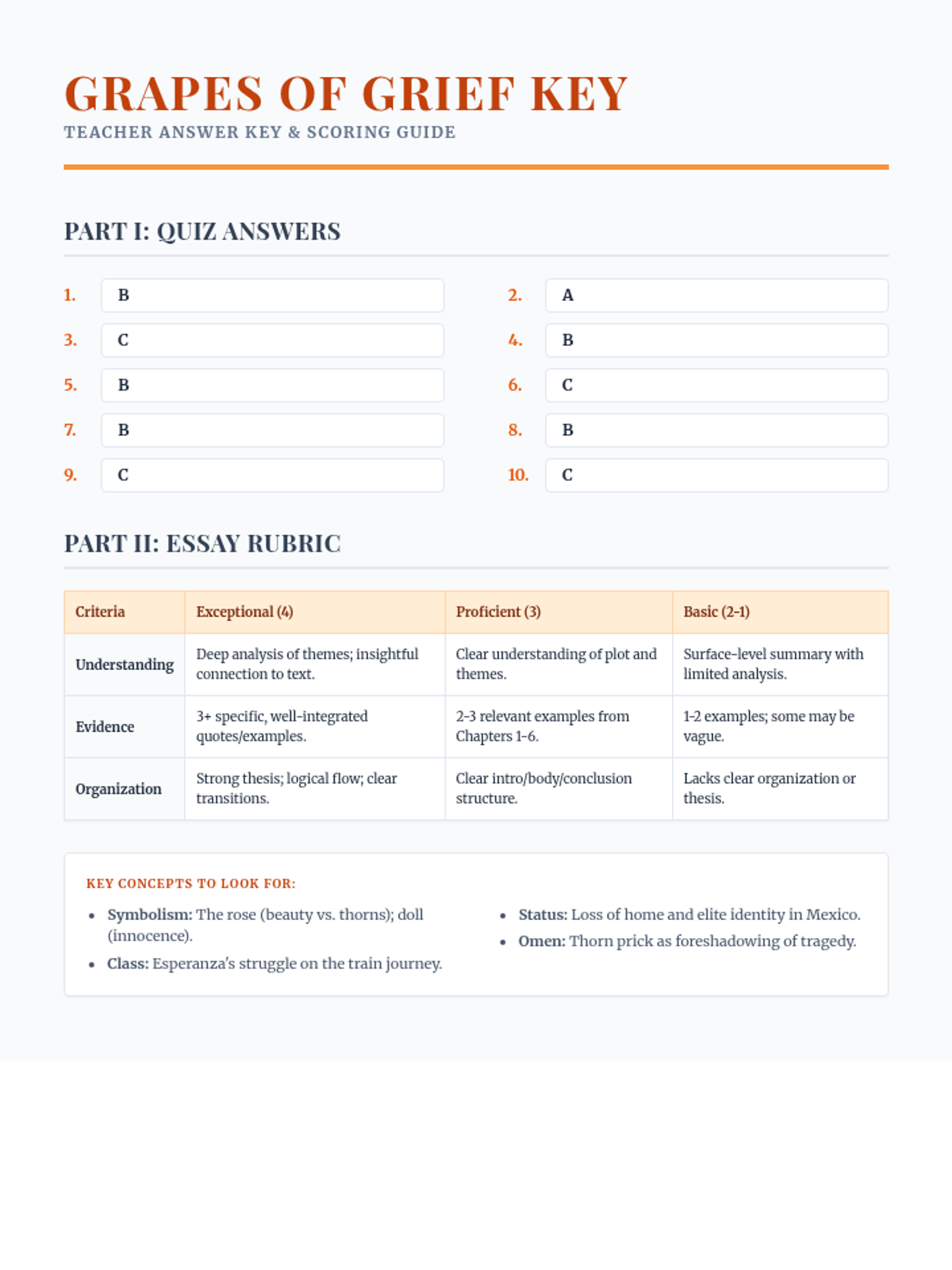 An answer key for the Grapes of Grief Quiz and a comprehensive rubric for the Thorns of Change Essays. Includes key concepts and themes teachers should look for in student responses.