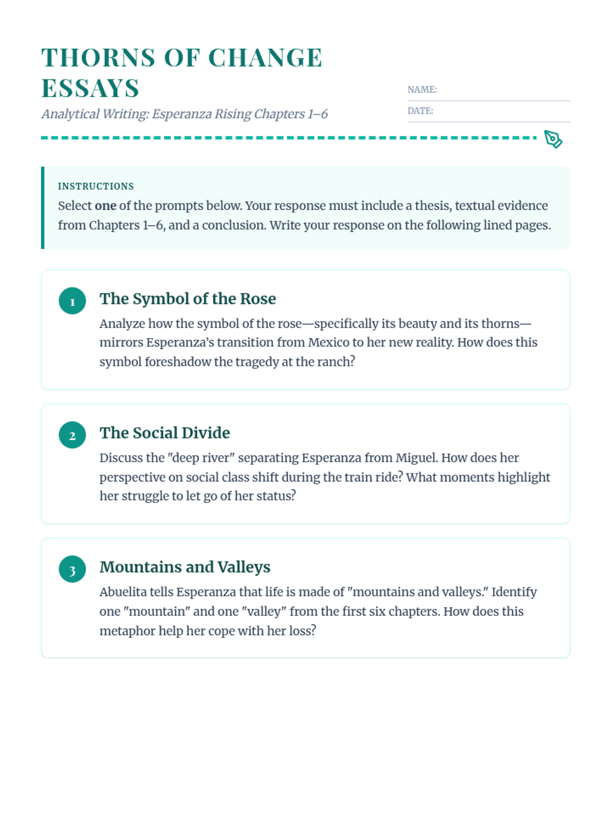 A set of three critical thinking essay prompts for the first six chapters of Esperanza Rising. Prompts focus on symbolism (roses), social class (the river), and metaphor (mountains and valleys). Includes multiple lined writing pages for student responses.