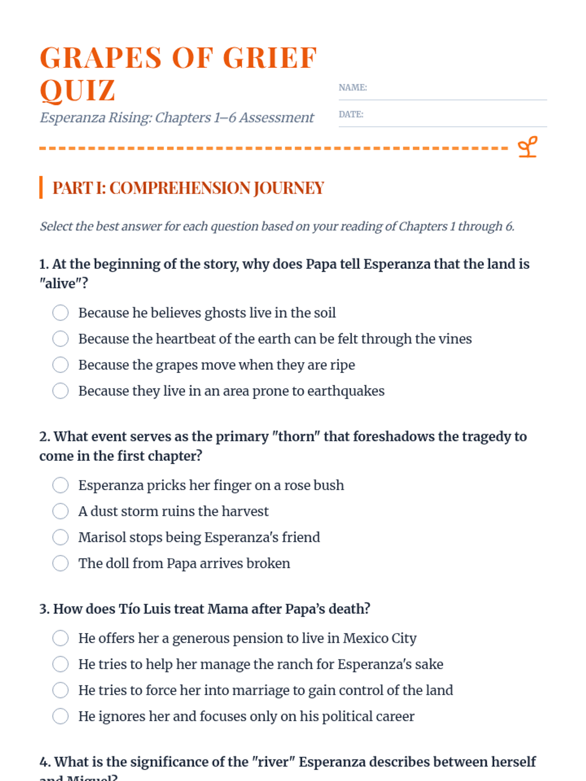 A 10-question multiple-choice quiz covering key events and symbols from the first six chapters of Esperanza Rising. Includes questions on foreshadowing, social class, and the inciting incident of the fire.