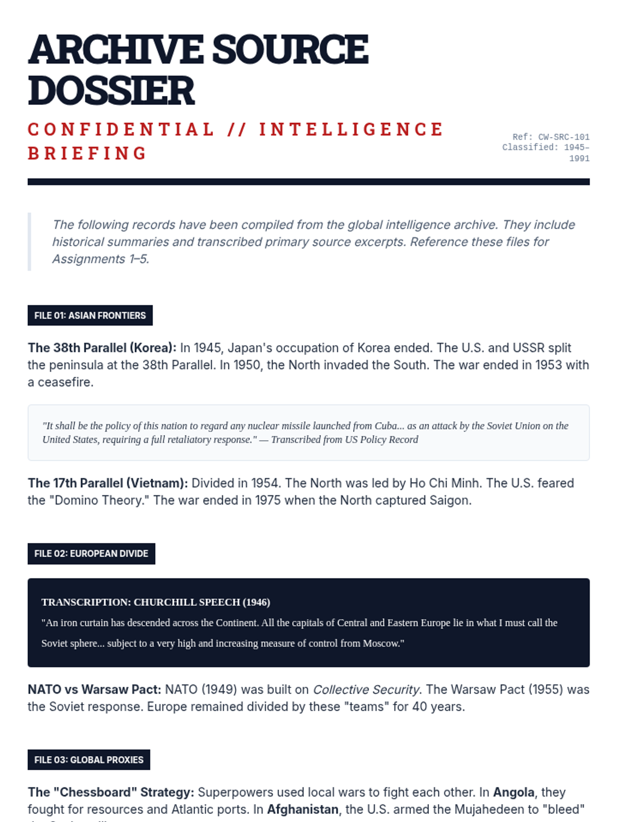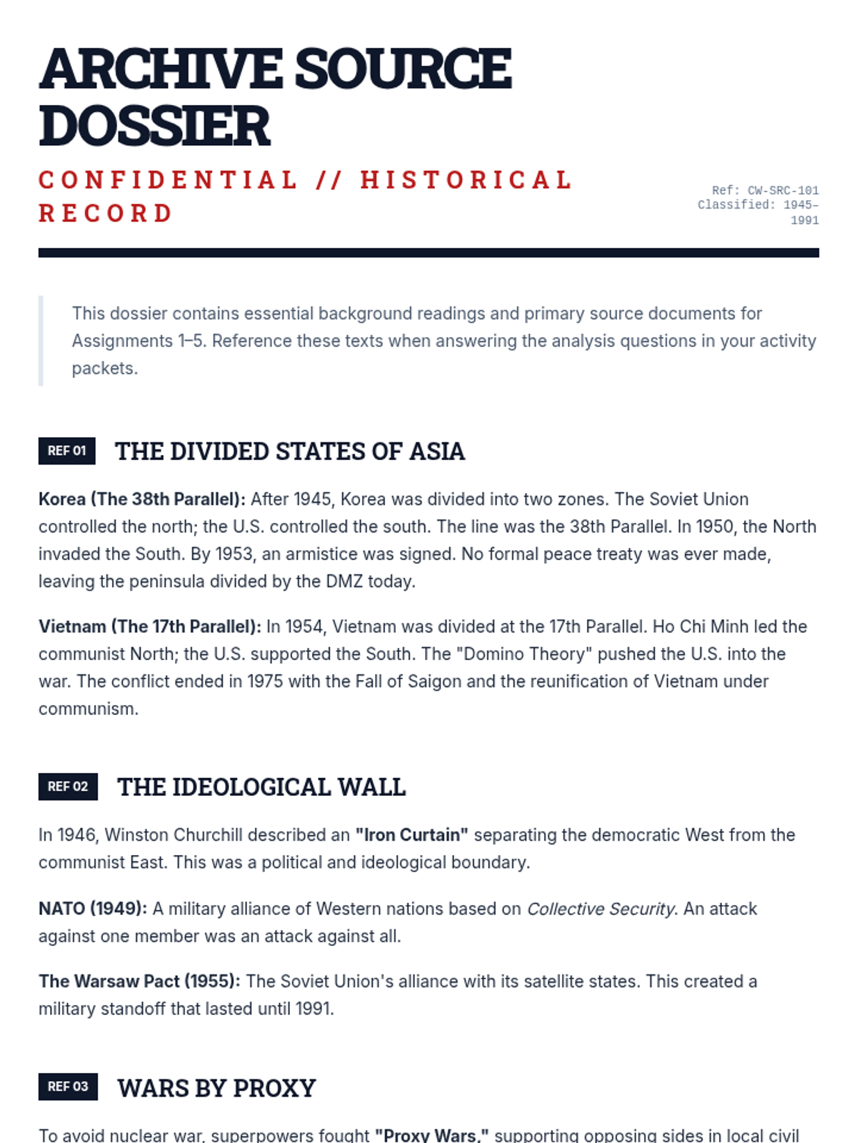 A comprehensive background reading packet providing the essential historical context and primary source excerpts for all five Cold War assignments. Updated for better page flow and layout.