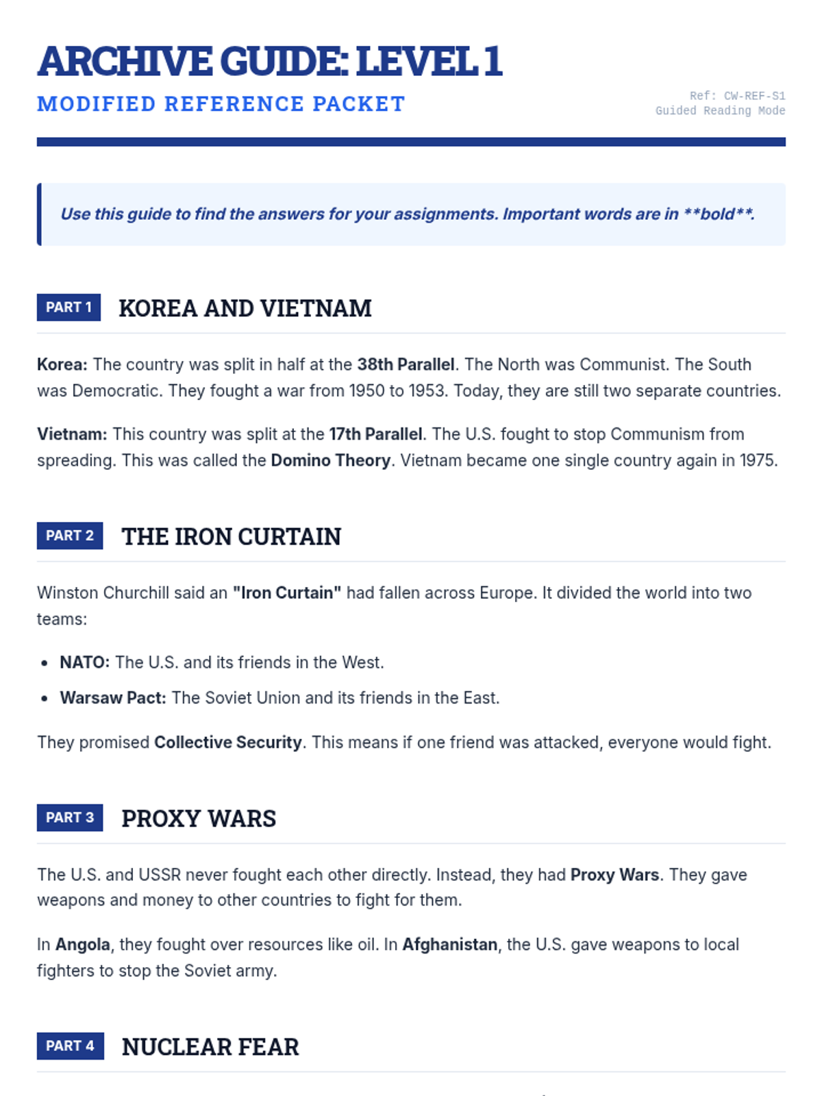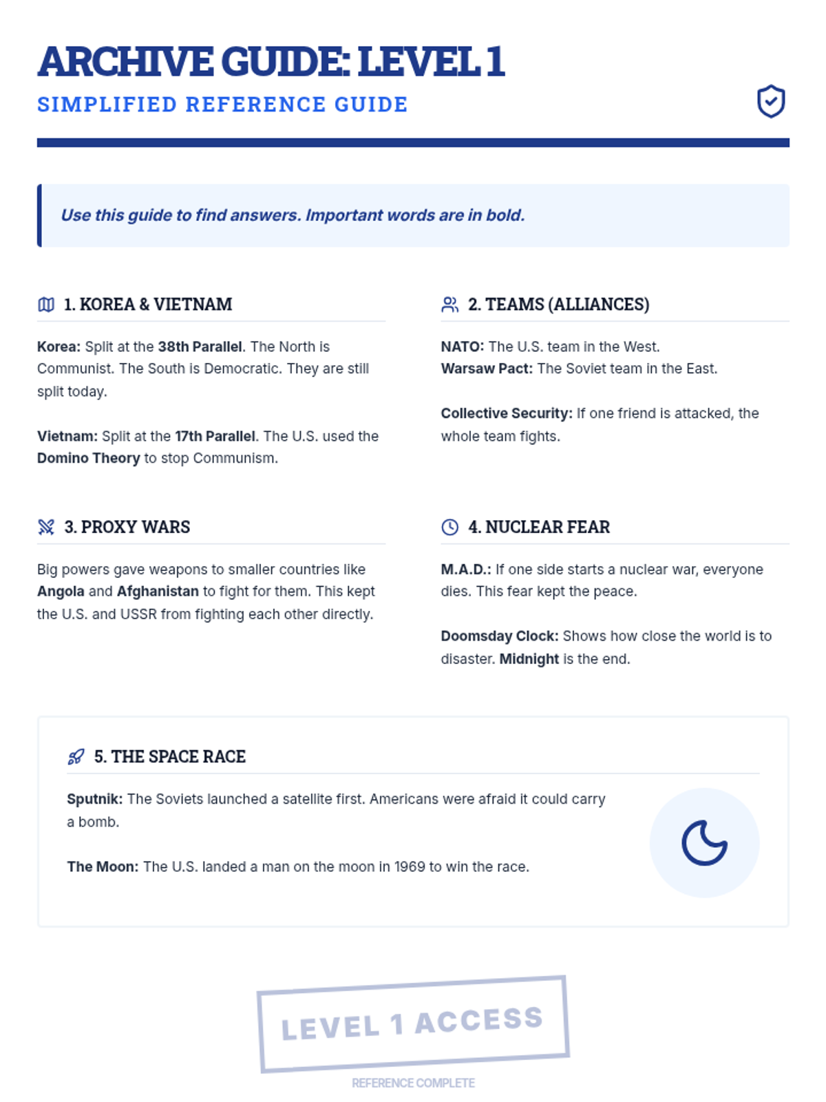 A simplified background reading guide for the Cold War intelligence assignments. Features easier vocabulary, icons for visual anchors, and chunked text for lower-level readers.