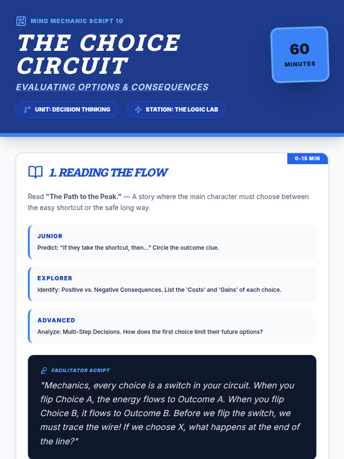 Facilitator script for Lesson 10 of the Mind Mechanics program. Focuses on evaluating choices and consequences using the "Choice Circuit" metaphor. Includes tiered prompts, simple language for ELL, and Habit 3 integration.