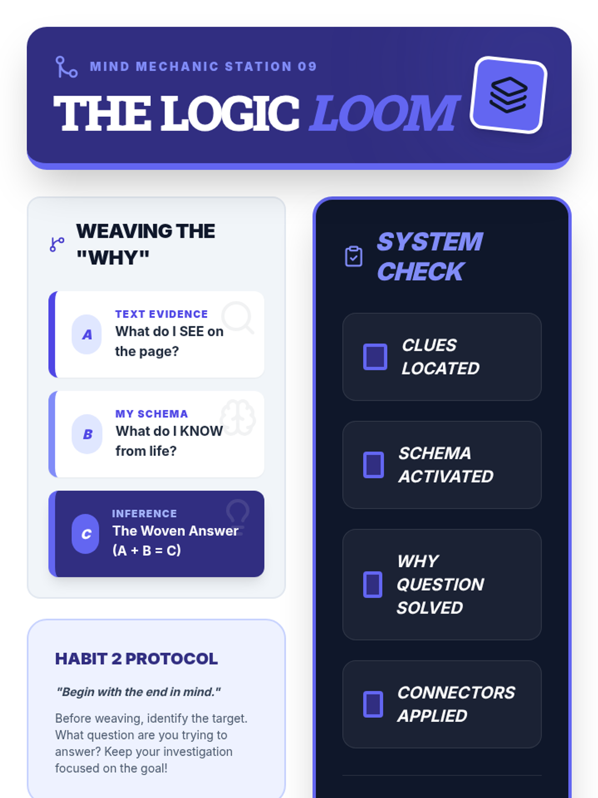 Visual anchor chart for Lesson 9, illustrating "The Logic Loom" weaving process for solving "Why" and "How" questions. Includes requested checkboxes and high-contrast technical aesthetics.