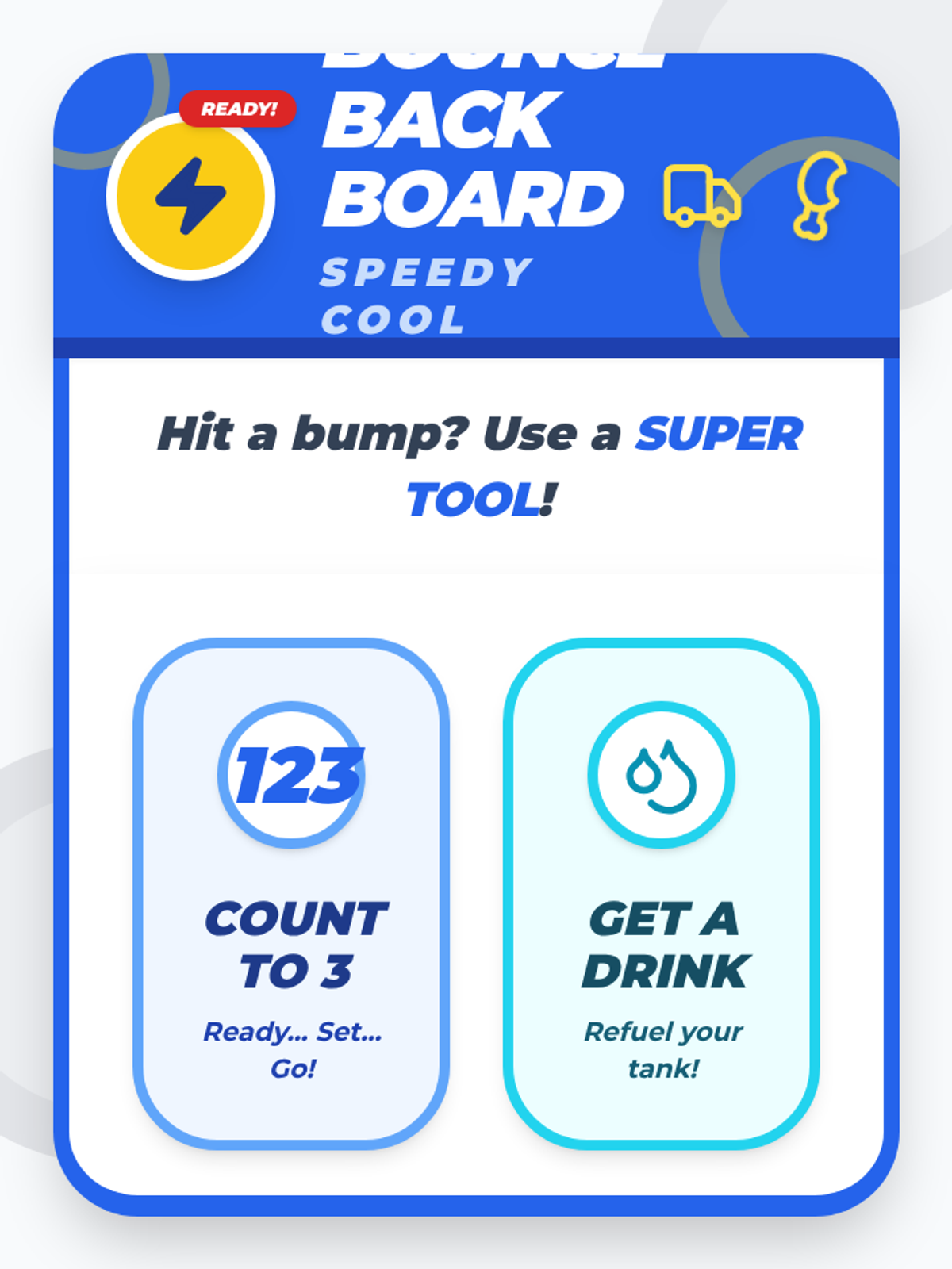 A visual choice board for Pre-K students to select a self-regulation strategy when they need to 'bounce back' from frustration. Features four clear, illustrated options including counting, drinking water, the cozy area, and breathing exercises.