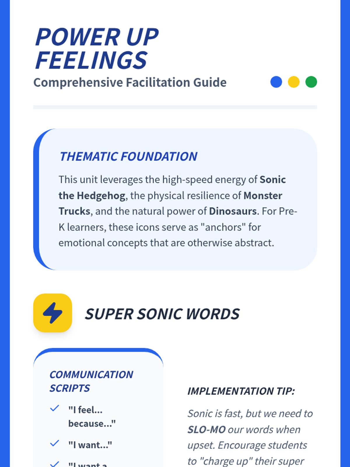 A comprehensive teacher guide for facilitating the 'Power Up Feelings' lessons. It provides pedagogical scripts, classroom management tips for handling triggers, and discussion prompts centered around the Sonic, dinosaur, and monster truck themes.