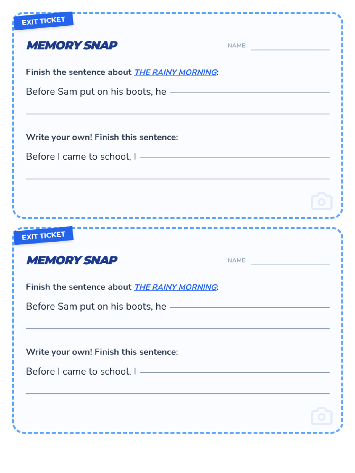 A set of two exit ticket slips (Memory Snap) for 1st grade, featuring sentence starters that check understanding of the concept 'before' in literature and real life.