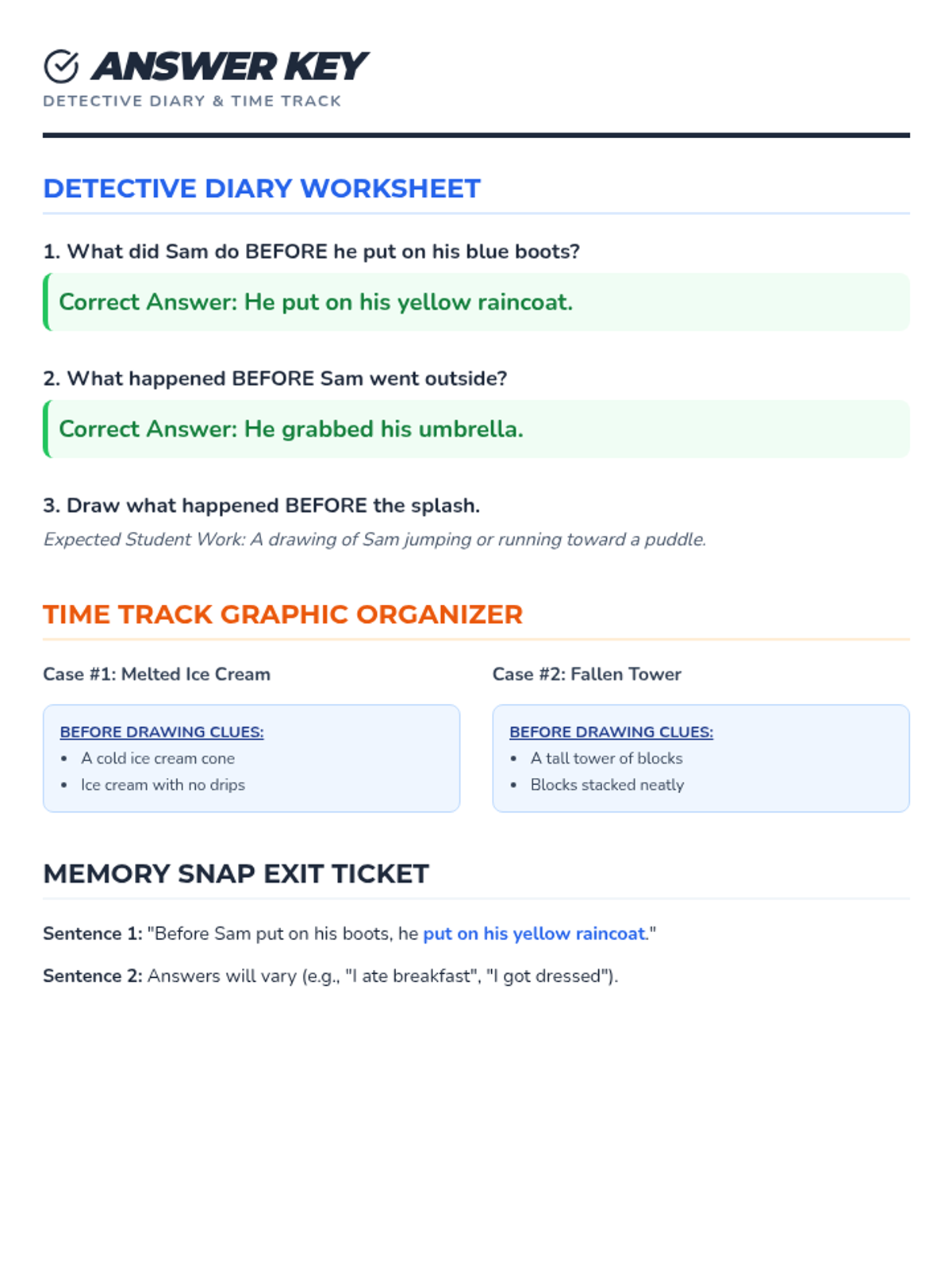 Answer key for the Detective Diary worksheet and Time Track organizer, providing teachers with expected student responses for 1st-grade sequencing tasks.