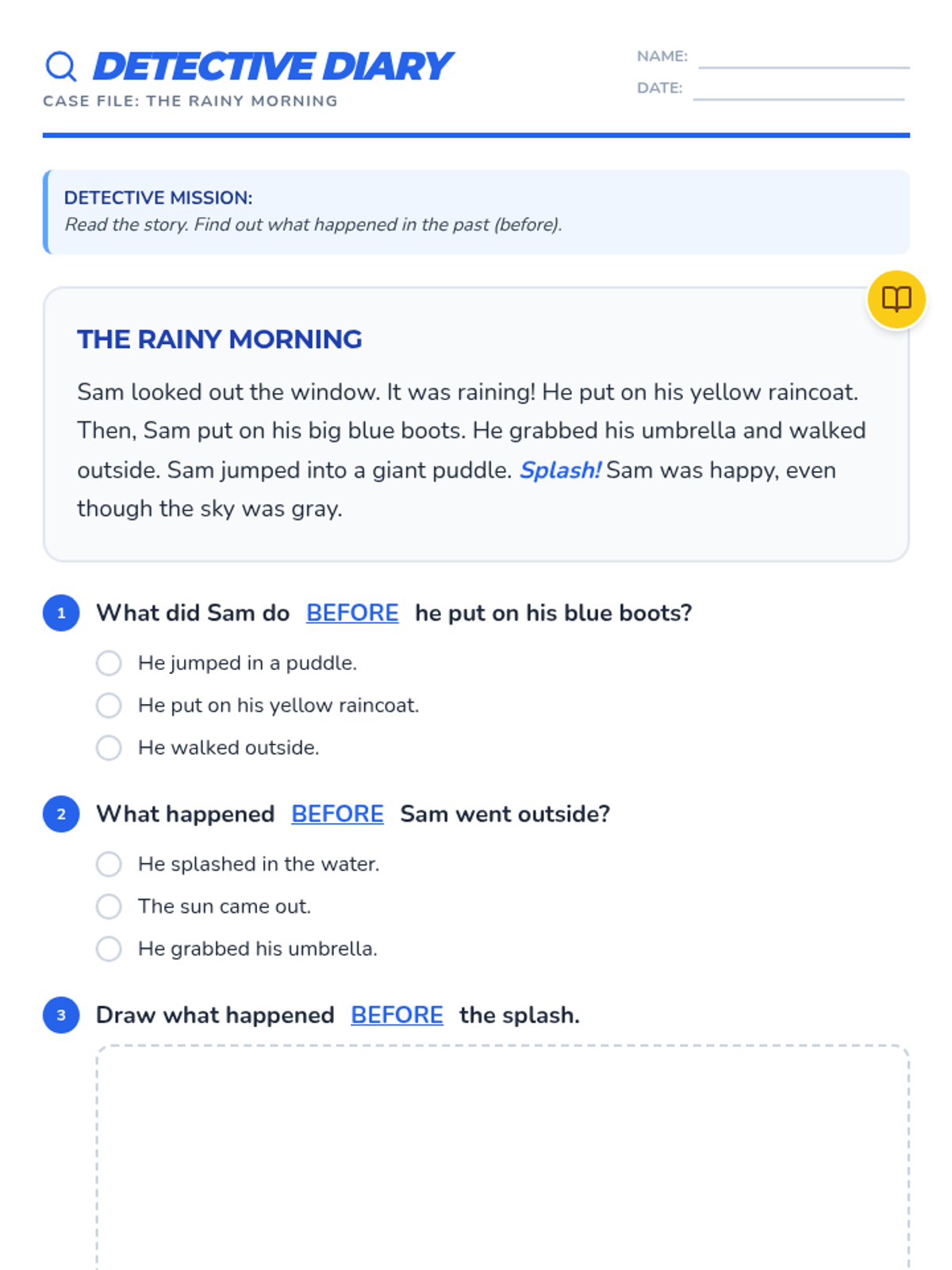 A reading comprehension worksheet for 1st grade focusing on sequencing and the concept of 'before' using a simple rainy day story.