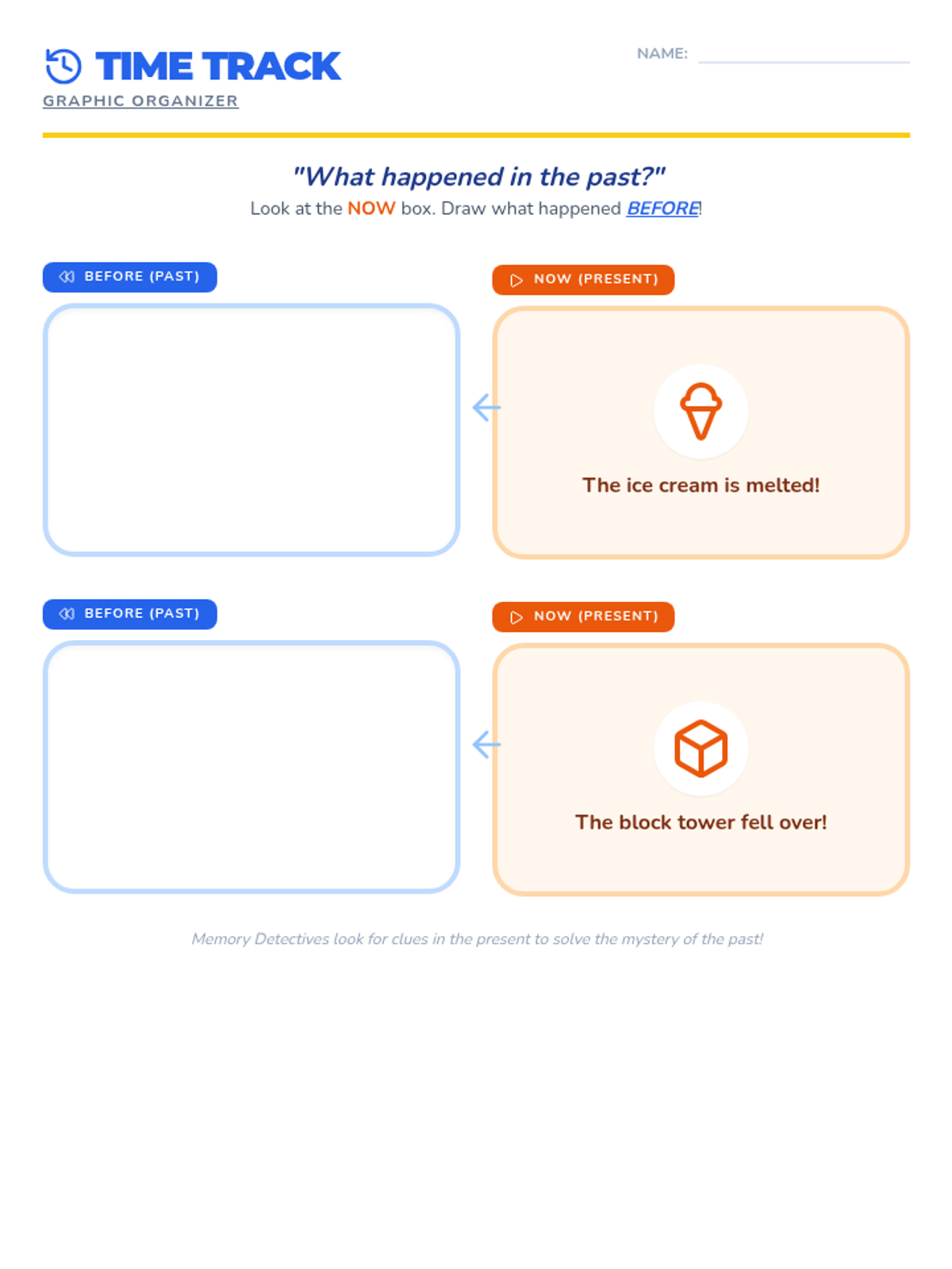 A graphic organizer for 1st grade that challenges students to deduce and draw what happened 'before' based on visual 'present' cues like melted ice cream or a fallen tower.