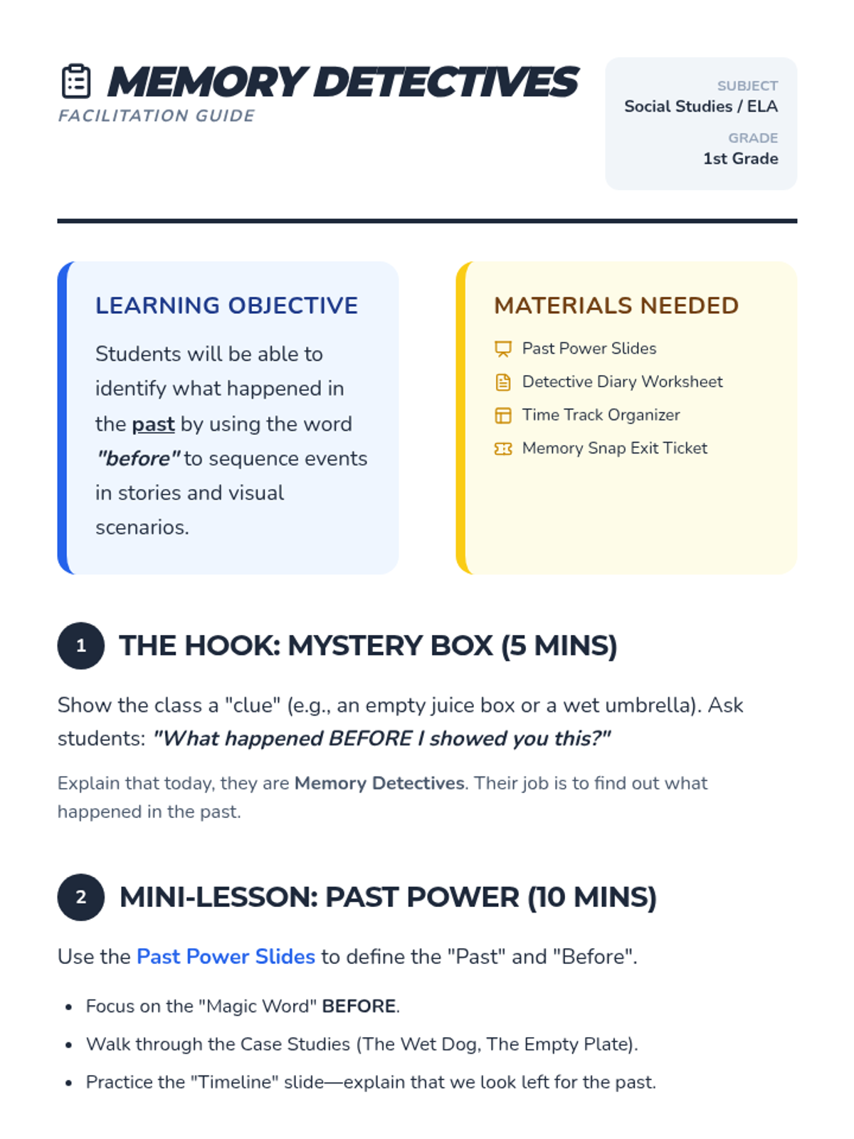 A comprehensive teacher-facing lesson plan for the Memory Detectives unit, outlining hook, instruction, guided practice, independent work, and differentiation strategies.