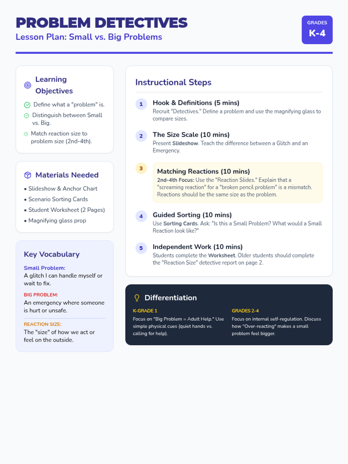 A comprehensive teacher's guide for the 20-minute Safety Shield lesson. Includes pacing, discussion prompts, key definitions, and instructions for managing the activities effectively. Revised to fit on a single page and improve layout.