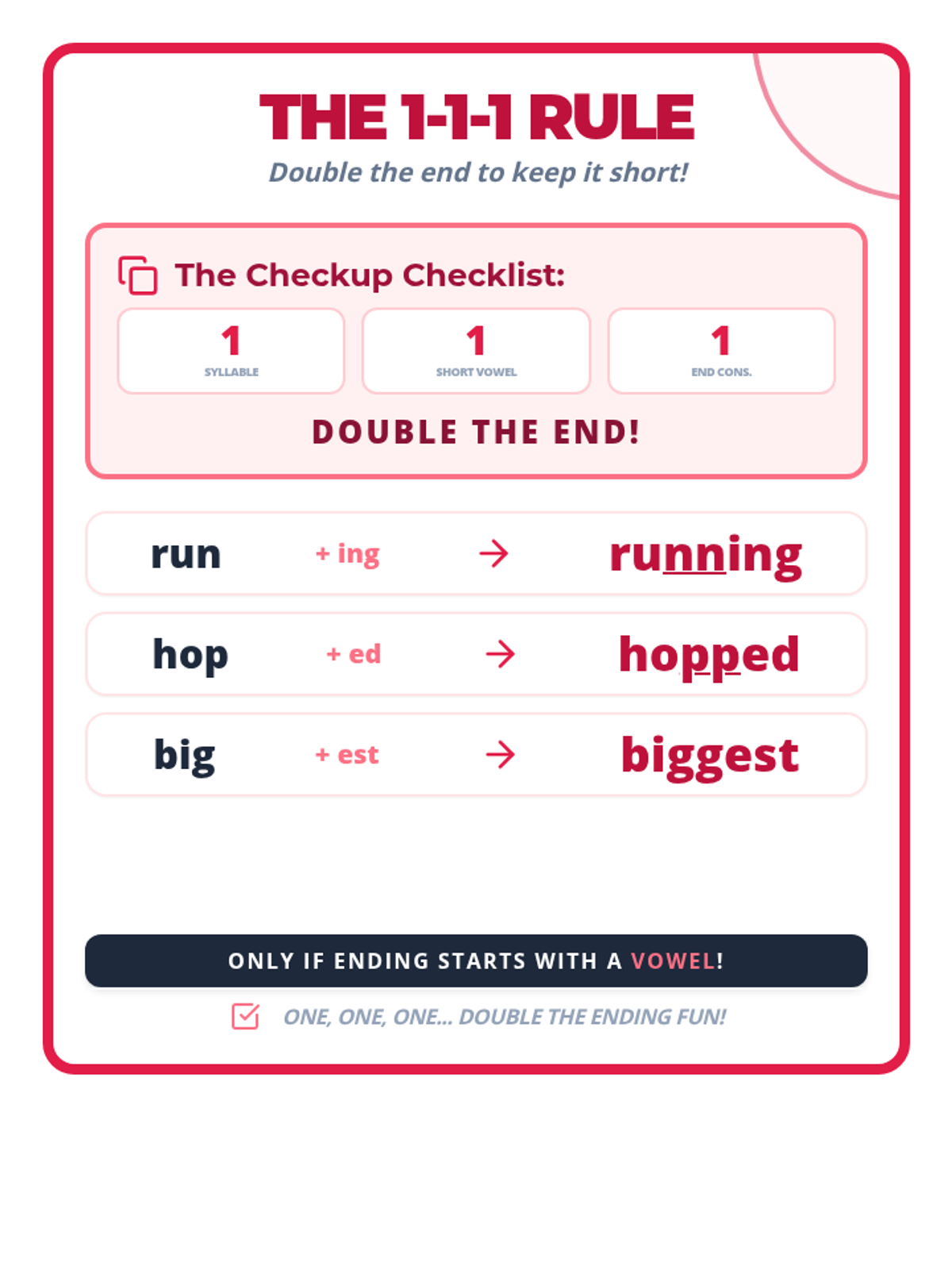 A full-page anchor chart for the 1-1-1 Doubling Rule, showing the three-step checklist for doubling final consonants before adding vowel suffixes.