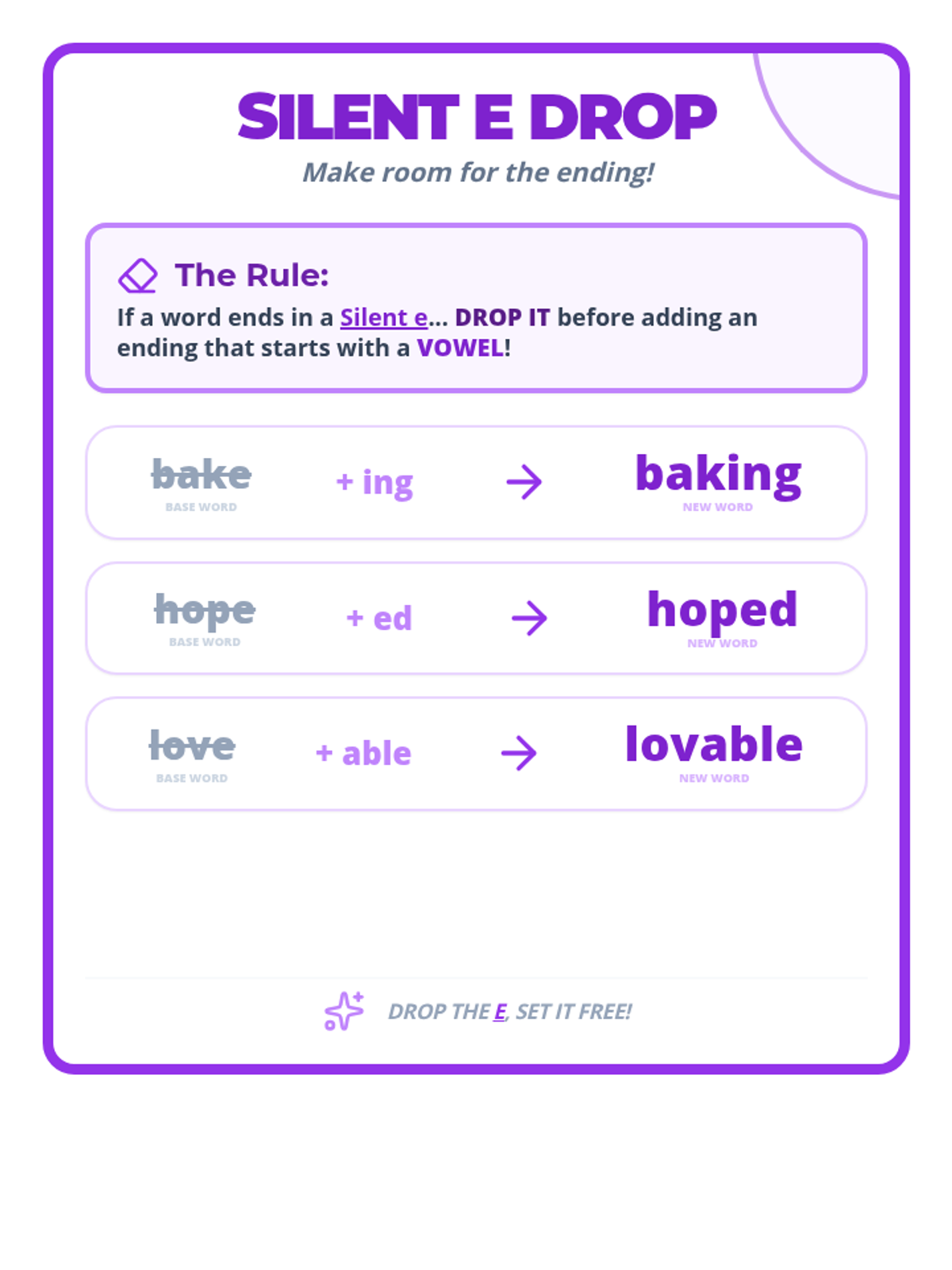 A full-page anchor chart for the Silent e Drop rule, showing the step-by-step process of removing the silent e before adding vowel suffixes.